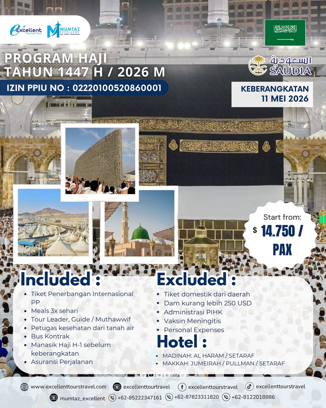 - ✨ Program Haji 1447 H – 2026 M ✨Bersama Excellent Tour & Travel x Mumtaz Excellent, mari wujudka