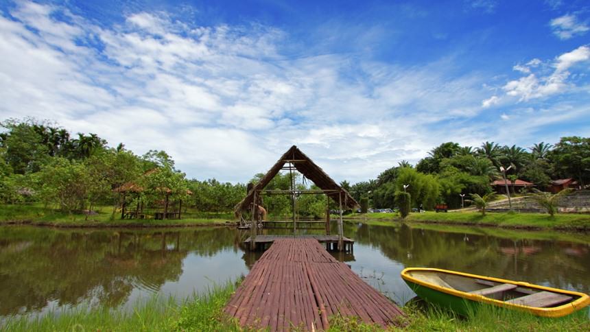 Kampung Ladang menawarkan suasana pedesaan yang asri dengan beragam perlengkapan berstandar internasional. Banyak wahanan permainan di sini, seperti ATV, sampan, flying fox, paint ball, trampolin, dan banyak lainnya.