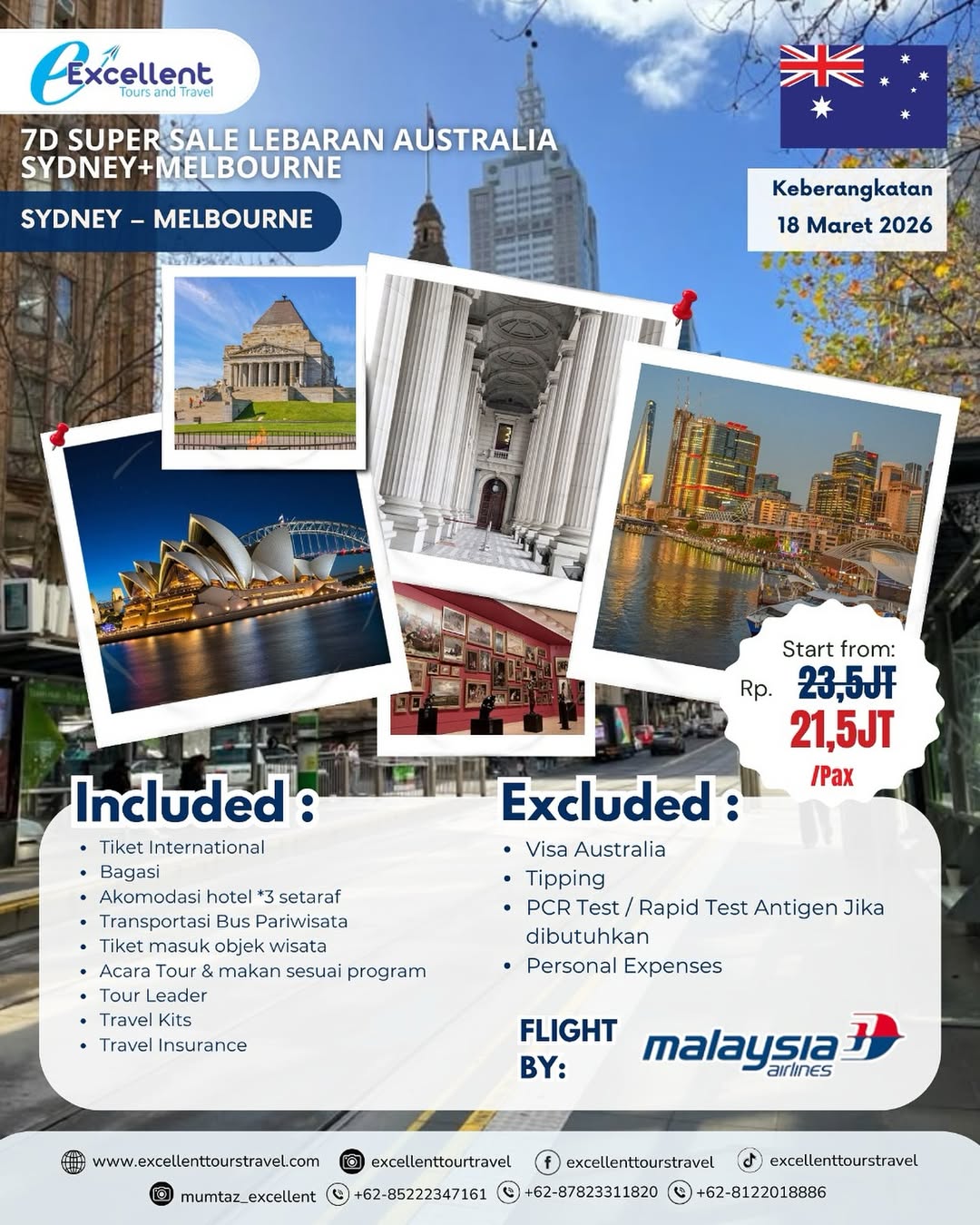 Nikmati liburan seru ke Sydney & Melbourne bareng Excellent Tour & Travel!Jelajahi keindahan ikon dunia seperti Sydney Opera House, Federation Square, hingga Great Ocean Road!💥✨ 🗓 Keberangkatan: 18 Maret 2026💸 Start from Rp 21,5 Juta/Pax ✅ Included:Tiket InternationalBagasiAkomodasi hotel *3 setarafTransportasi Bus PariwisataTiket masuk objek wisataAcara Tour & makan sesuai…