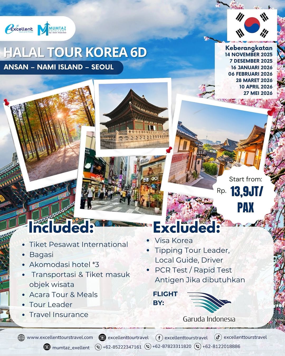 dengan Cara Halal & Nyaman! β¨Rasakan pengalaman tak terlupakan menjelajahi Negeri Ginseng tanpa khawatir soal makanan & ibadah! πΈ β¨ HALAL TOUR KOREA 6D β¨π Ansan β Nami Island β SeoulNikmati keindahan alam, budaya, dan kuliner halal dalam satu paket perjalanan yang seru & penuh kenangan ππΏ π Keberangkatan:14 November…