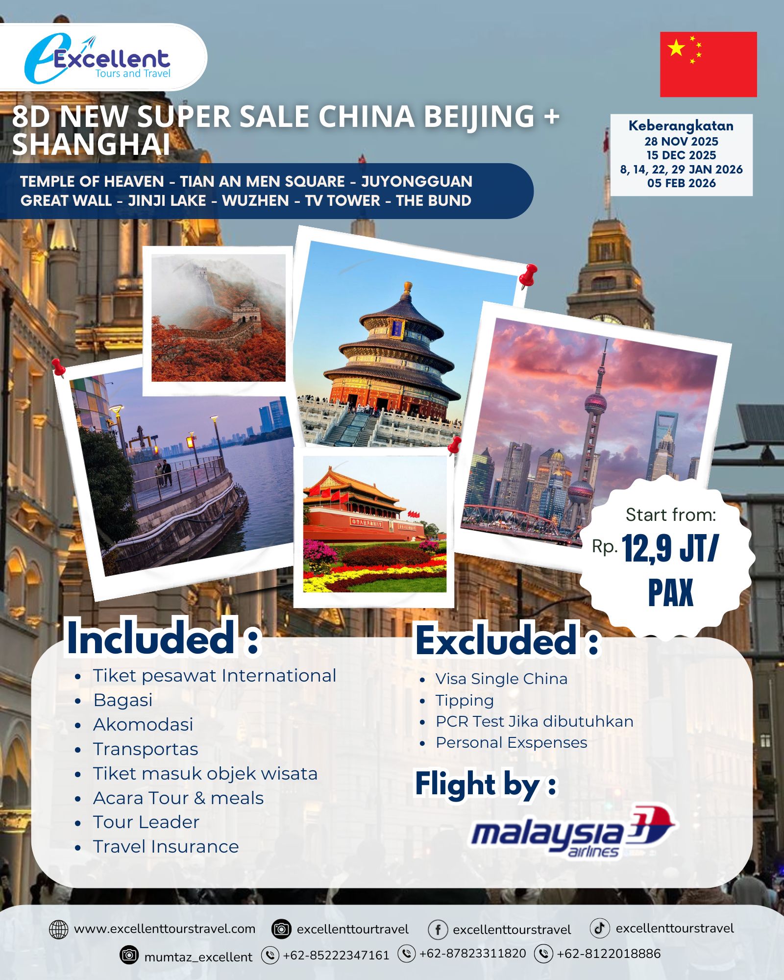 TEMPLE OF HEAVEN – TIAN AN MEN SQUARE – JUYONGGUAN GREAT WALL – jinJI LAKE – WUZHEN – TV TOWER – THE BUND ✨ Jelajahi Keajaiban Negeri Tirai Bambu! 🇨🇳Dari megahnya The Great Wall, sampai suasana modern di Shanghai — semua bisa kamu temukan dalam satu perjalanan tak terlupakan! 🏯🌆…