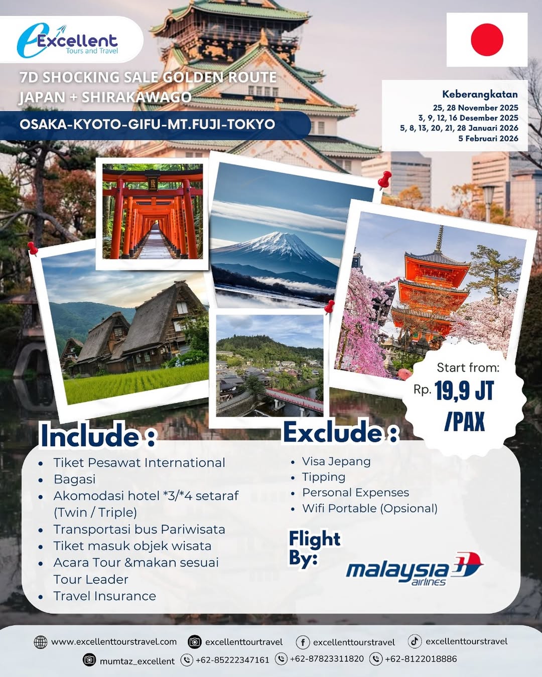 Bayangkan berjalan di desa bersalju Shirakawago, melihat Gunung Fuji dari dekat, dan menikmati keindahan Kyoto & Tokyo dalam satu perjalanan luar biasa! 🗻🌸 đź’° Start from Rp 19,9 Jt/pax📆 Departure 25, 28 November 20253, 9, 12, 14, 16 Desember 20255, 8, 13, 20, 21, 28 Januari 20265 Februari 2026 Includedâś…Tiket…