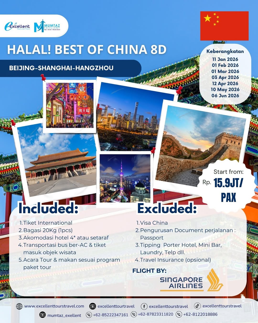 ✨ HALAL! BEST OF CHINA – 8 HARI ✨Siap menjelajahi keindahan China dalam perjalanan halal yang penuh pengalaman tak terlupakan? 🌏Dari megahnya Tembok Besar China, gemerlap Shanghai, hingga tenangnya Hangzhou, semuanya tersaji dalam satu paket eksklusif bersama Mumtaz Excellent. 🏙️ Beijing – Shanghai – Hangzhou🗓️ Keberangkatan:11 Jan | 01 Feb…