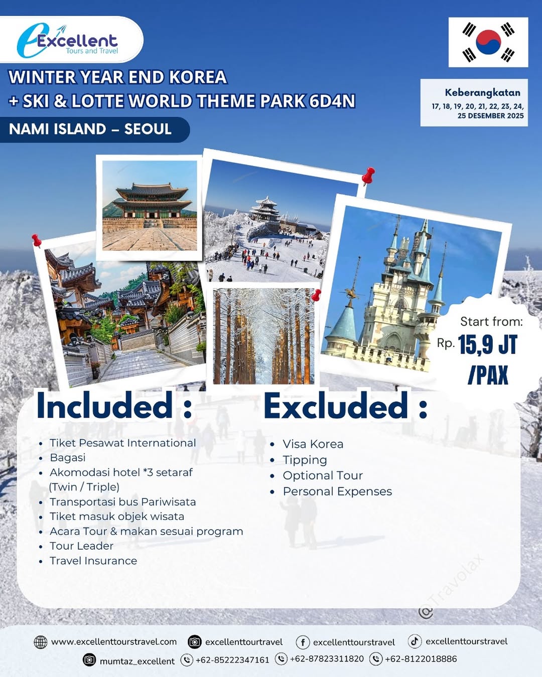 Main salju di Nami Island, seru-seruan di Lotte World, dan rasakan pengalaman ski yang tak terlupakan, Bareng Excellent Tours & Travel, akhir tahunmu pasti luar biasa!🏔🎢 đź—“ Keberangkatan: 17, 18, 19, 20, 21, 22, 23, 24, 25 Desember 2025đź’° Start from Rp 15,9 Jt/pax Includedâś…Tiket Pesawat InternationalBagasiAkomodasi hotel *3 setaraf(Twin…