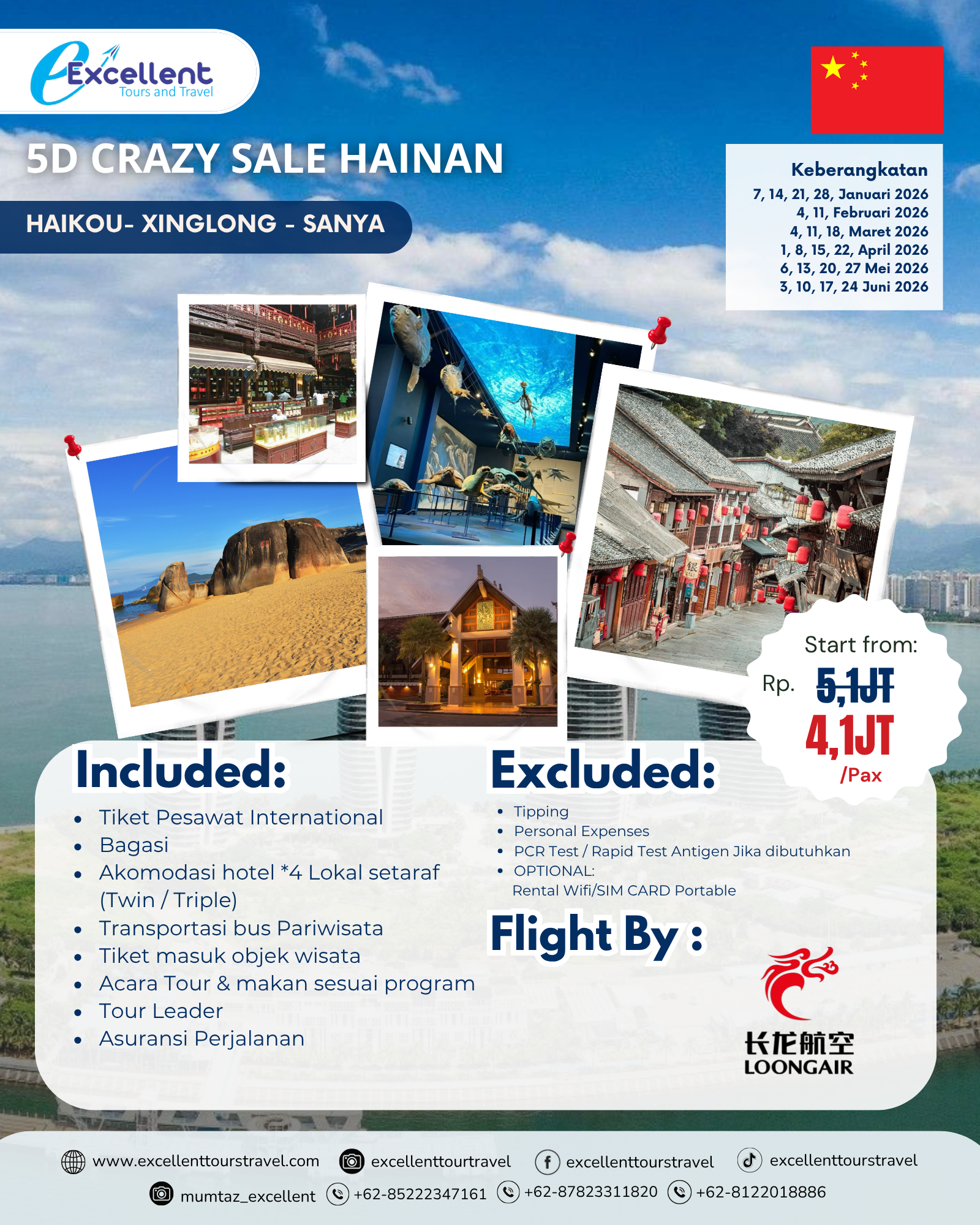 Siap jelajah pantai eksotis, kota modern, budaya unik, dan kuliner khas Hainan yang bikin nagih? 😍🌴 Keberangkatan: 7, 14, 21, 28, Januari 20264, 11, Februari 20264, 11, 18, Maret 20261, 8, 15, 22, April 20266, 13, 20, 27 Mei 20263, 10, 17, 24 Juni 2026💸 Start from Rp 4,1 Jt/Pax…