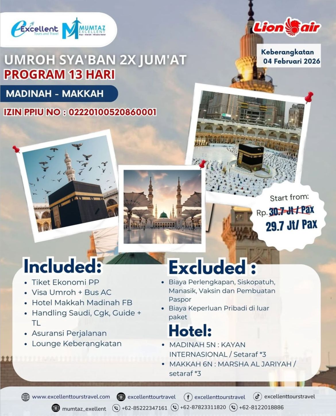 UMROH SYA’BAN 2X JUM’AT β 13 HARI PENUH BERKAH!Rasakan ketenangan ibadah di bulan Sya’ban dan nikmati dua kali shalat Jumat di Tanah Suci. Keberangkatan: 04 Februari 2026 *Price start from: IDR 29,7 Juta/Pax Anda sudah mendapatkan perjalanan umroh yang nyaman, aman, dan berkelas: INCLUDE: EXCLUDED:
