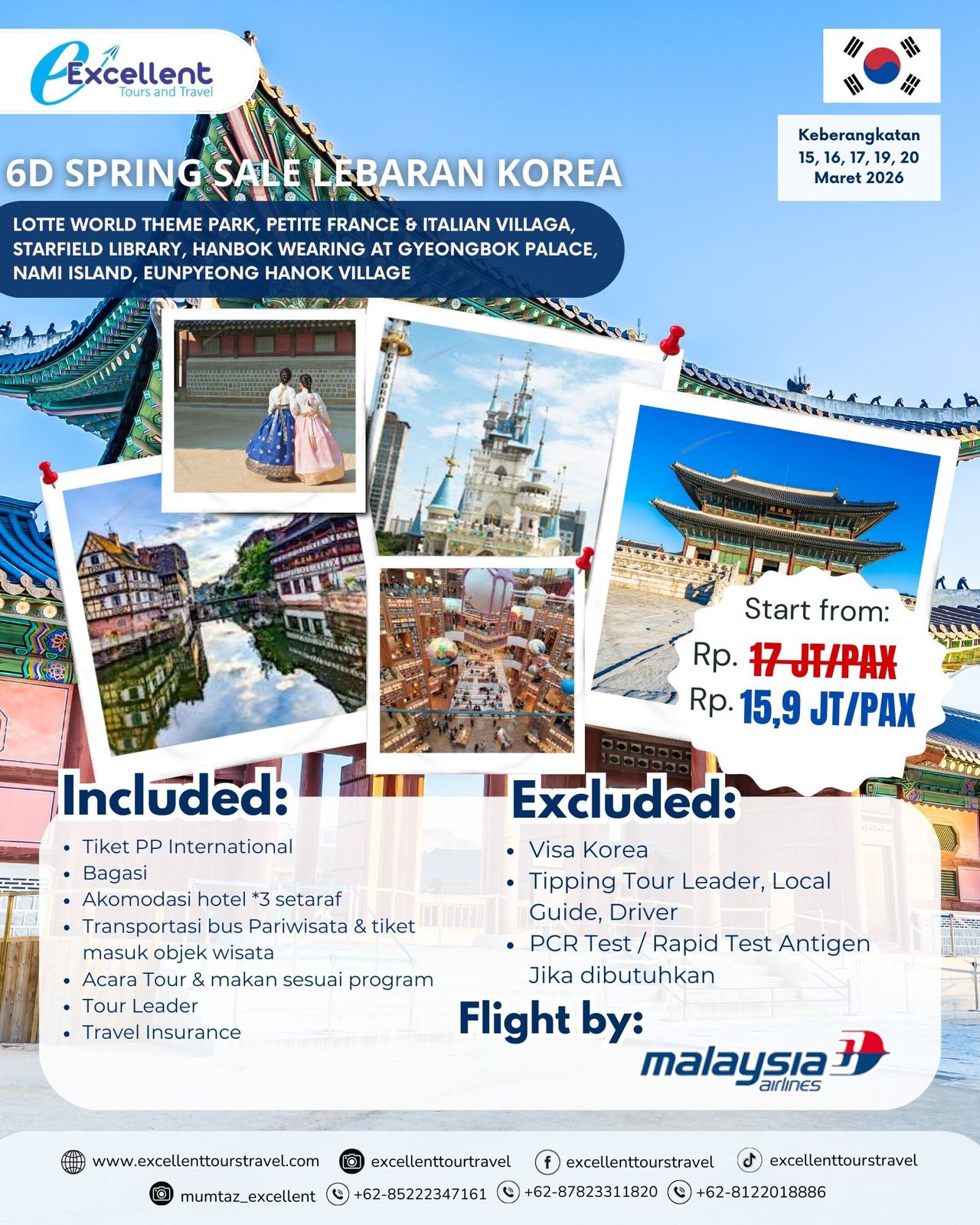 Liburan Lebaran makin seru dengan menjelajah Korea Selatan di musim semi!Nikmati perpaduan wisata modern, budaya, dan spot ikonik favorit wisatawan ✨ 📍 Highlight Destinasi:Lotte World Theme ParkPetite France & Italian VillageStarfield LibraryHanbok Wearing at Gyeongbok PalaceNami IslandEunpyeong Hanok Village 📅 Keberangkatan:15, 16, 17, 19 & 20 Maret 2026 💳 Harga…