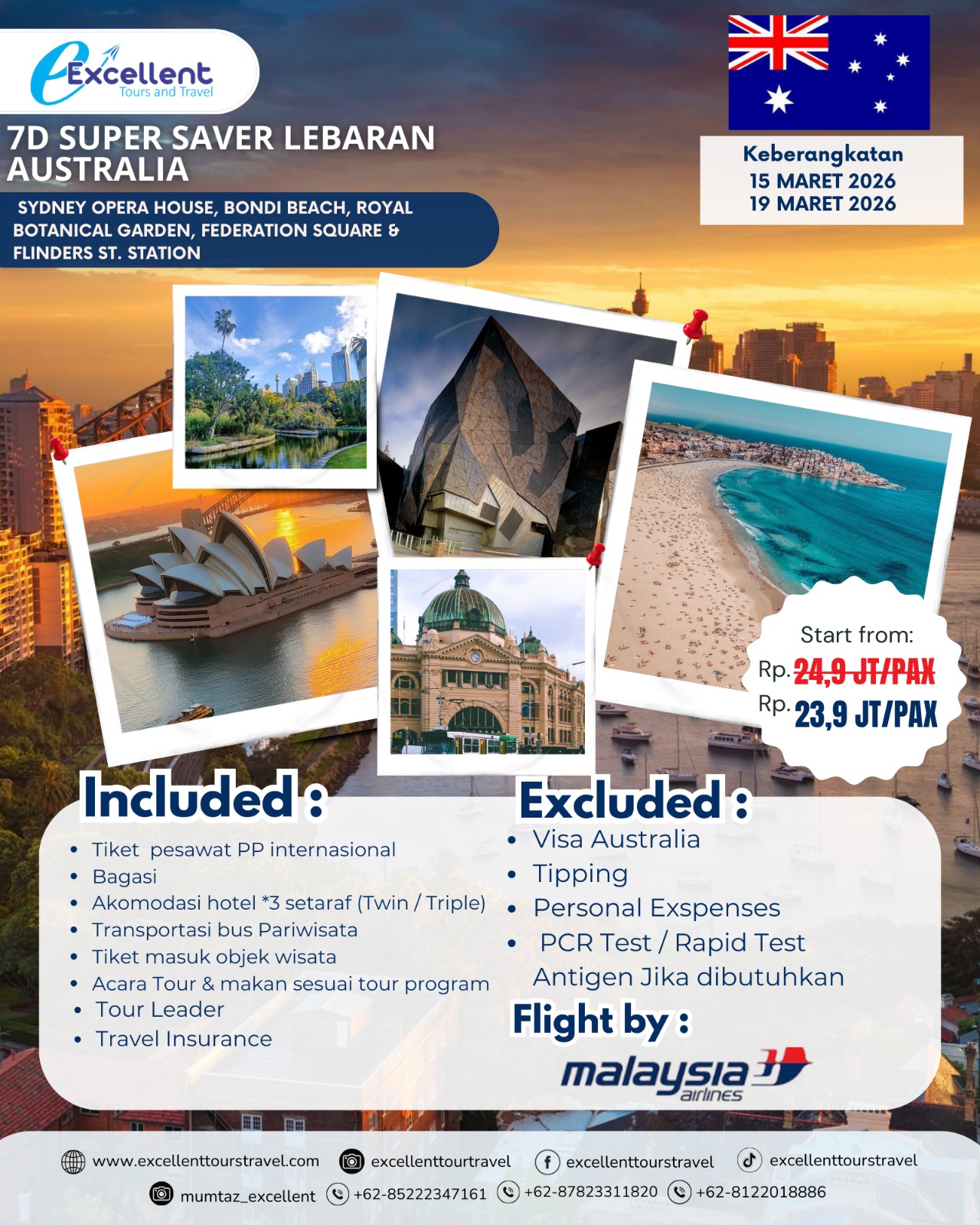 Rasakan liburan Lebaran beda dari biasanya 🌏Mulai dari megahnya Sydney Opera House, indahnya Bondi Beach, hingga pesona kota Melbourne yang classy dan penuh budaya. Harga mulai dari: 23.990.000 !!! ✈️ By Malaysia Airlines🏙️ City tour ikonik & nyaman👨👩👧👦 Cocok untuk liburan keluarga & sahabat💰 Harga super saver, kualitas tetap premium…