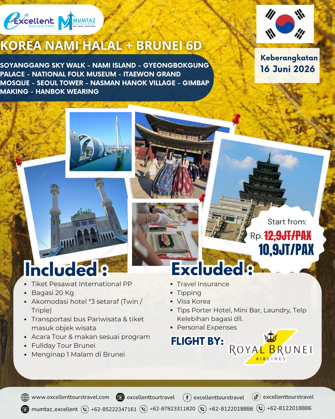 Jelajahi 2 negara sekaligus dalam 1 perjalanan seru! 🇰🇷🇧🇳Nikmati keindahan Nami Island, megahnya Gyeongbokgung Palace, hingga city view dari N Seoul Tower. Program ramah Muslim dengan halal meals & tour leader berpengalaman.Bonus 1 malam menginap di Brunei Darussalam + kunjungan ke ikon megah Masjid Sultan Omar Ali Saifuddien dan explore…
