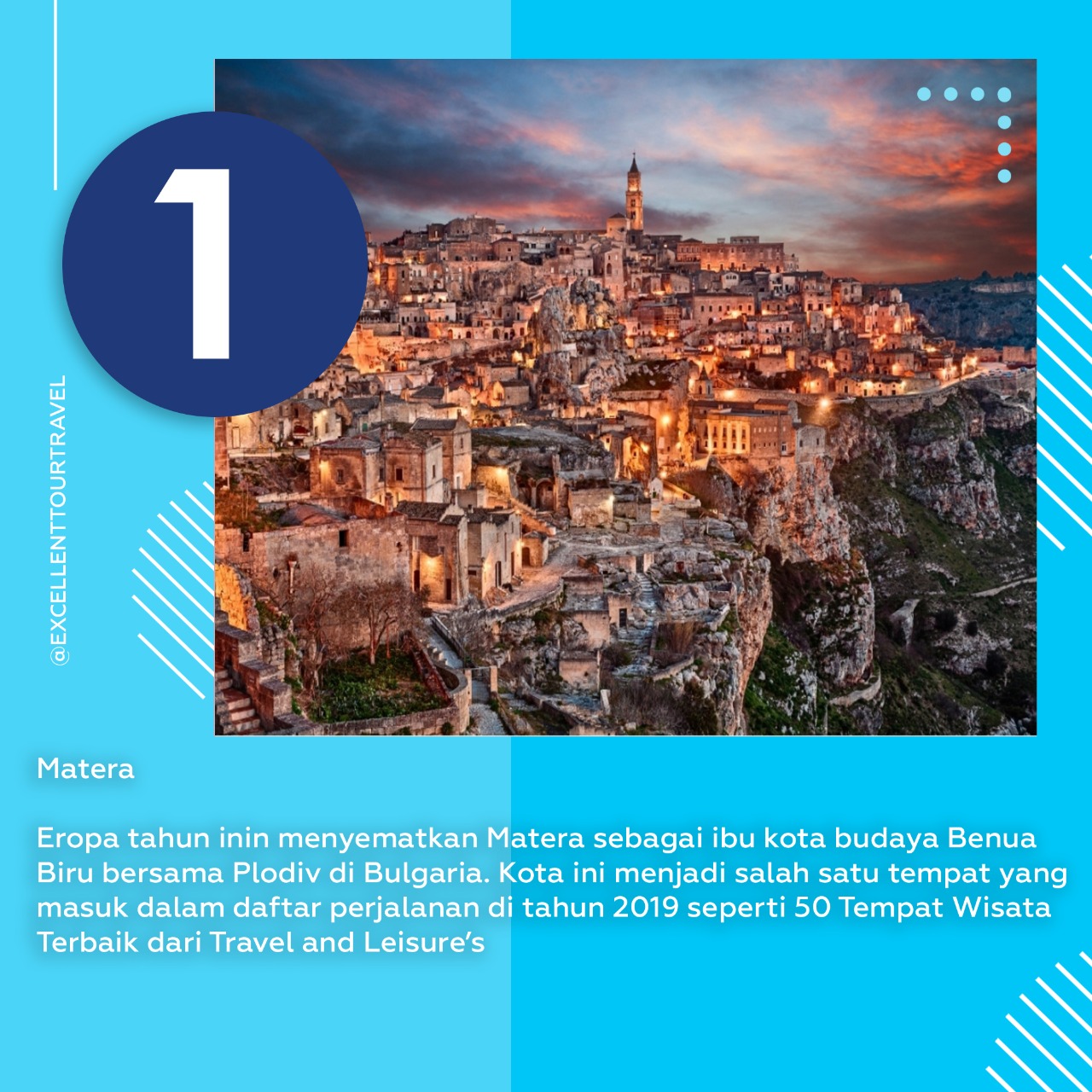 Eropa tahun ini menyematkan Matera sebagai ibu kota budaya Benua Biru bersama Plodiv di Bulgaria. Kota ini menjadi salah satu tempat yang masuk dalam daftar perjalanan di tahun 2019 seperti 50 Tempat Wisata Terbaik dari Travel and Leisure’s. Matera juga masuk dalam kategori 50 Tempat Terbaik untuk Bepergian Tahun 2019 dari National Geographic. Arsitektur Digest’s juga memasukkan Matera ke dalam 20 Tempat Wisata Terbaik 2019. - Ischia