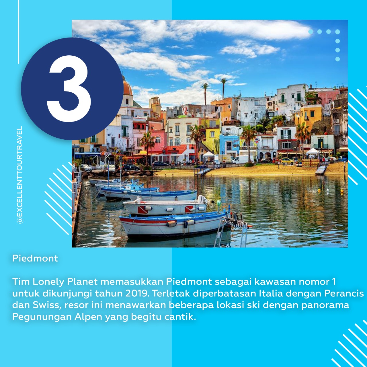 Tim Lonely Planet memasukkan Piedmont sebagai kawasan nomor 1 untuk dikunjungi tahun 2019. Terletak di perbatasan Italia dengan Perancis dan Swiss, resor ini menawarkan beberapa lokasi ski dengan panorama Pergunungan Alpen yang begitu cantik. Turin yang ada di kawasan Piedmont tidak hanya menjadi markas tim raksasa Italia, Juventus. Kota itu merupakan rumah Museum Otomotif Nasional dan pabrik Fiat Lingotto yang menampilkan jaur uji boca di atas atap. Satu keunikan Piedmont bisa ditemukan di Kota Ivrea, Provinsi Torino. Di sini diadakan pertarungan makanan besar-besaran setiap tahunnya. - Palermo