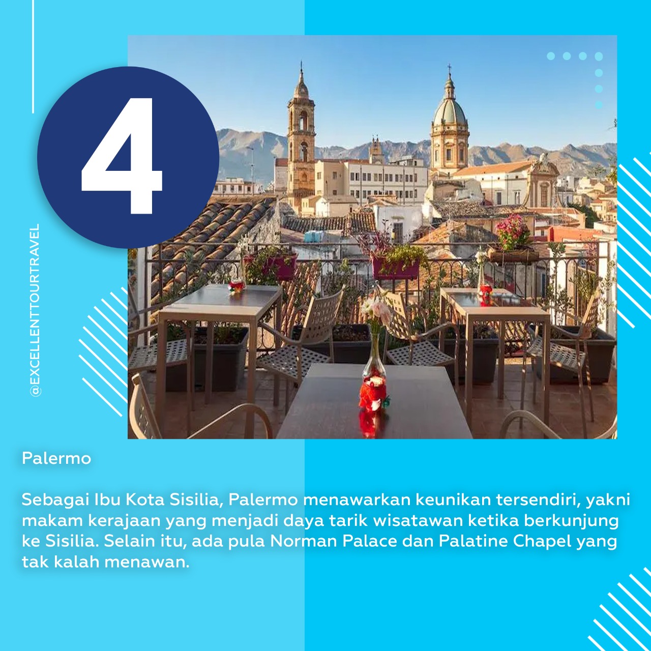 Sebagai Ibu Kota Sisilia, Palermo menawarkan keunikan tersendiri, yakni makam kerajaan yang menjadi daya tarik wisatawan ketika berkunjung ke Sisilia. Selain itu, ada pula Norman Palace dan Palatine Chapel yang tak kalah menawan. Wisatawan juga bisa mengunjungi Ballarò Street Market. Sementara spot panorama bisa didapatkan di Gunung Pellegrino. Dari atas gunug itu. Panorama kota dari ketinggian yang instagramable sayang untuk dilewatkan.