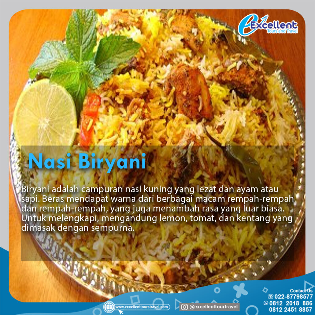 Biryani adalah campuran nasi kuning yang lezat dan ayam atau sapi.Beras mendapat warna dari berbagai macem rempah-rempah dan rempah-rempah,yang juga menambah rasa yang luar biasa.untuk melengkapi,mengandung lemon,tomat,dan kentang yang di masak dengan sempurna.