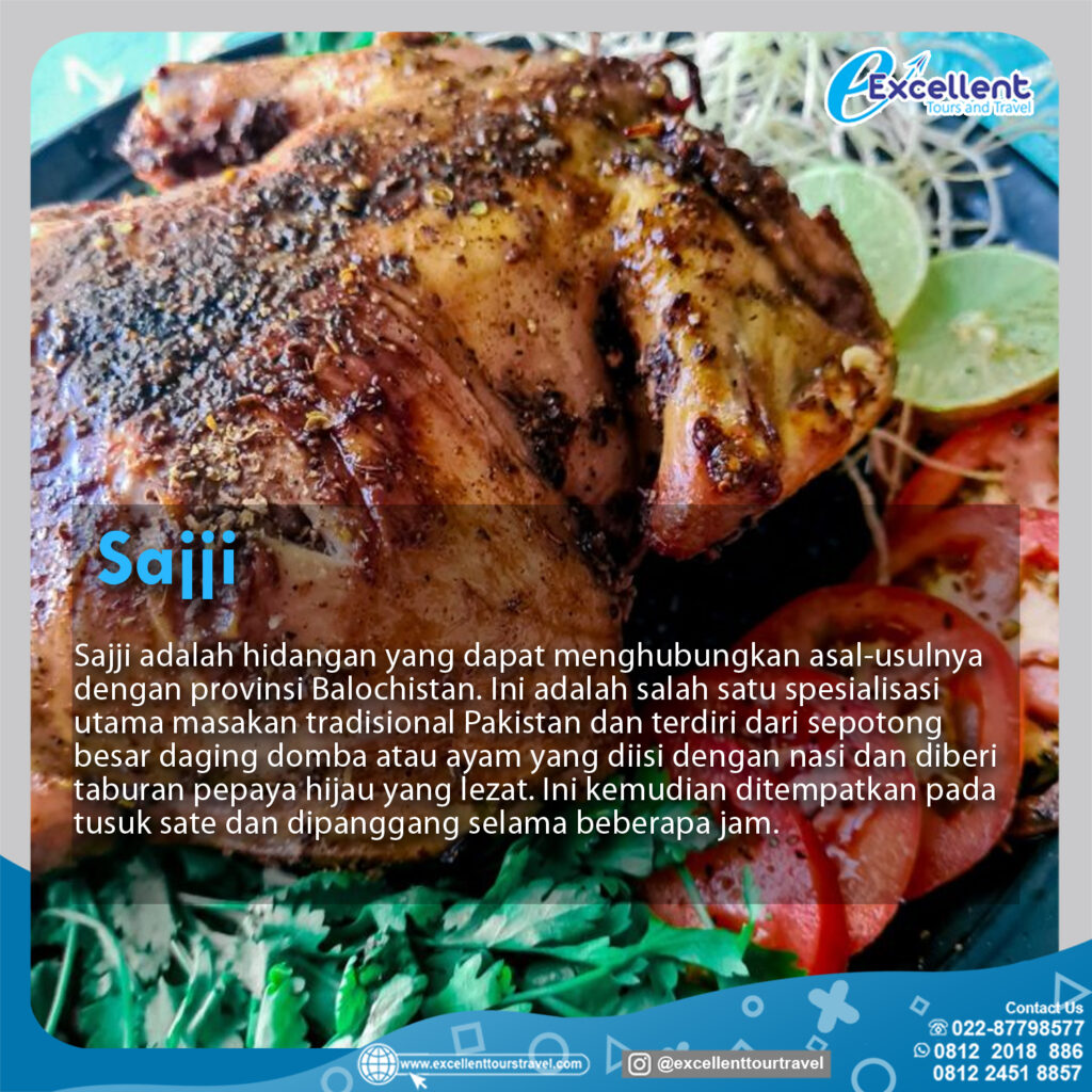 Sajji adalah hidangan yang dapat menghubungkan asal-usulnya dengan provinsi Balochistan.Ini adalah salah satu spesialisasi utama masakan tradisional Pakistan dan terdiri dari sepotong besar daging domba atau ayam yang diisi dengan nasi dan diberi taburan pepaya hijau yang lezat.Ini kemudian ditempatkan pada tusuk sate dan di panggang selama beberapa jam.