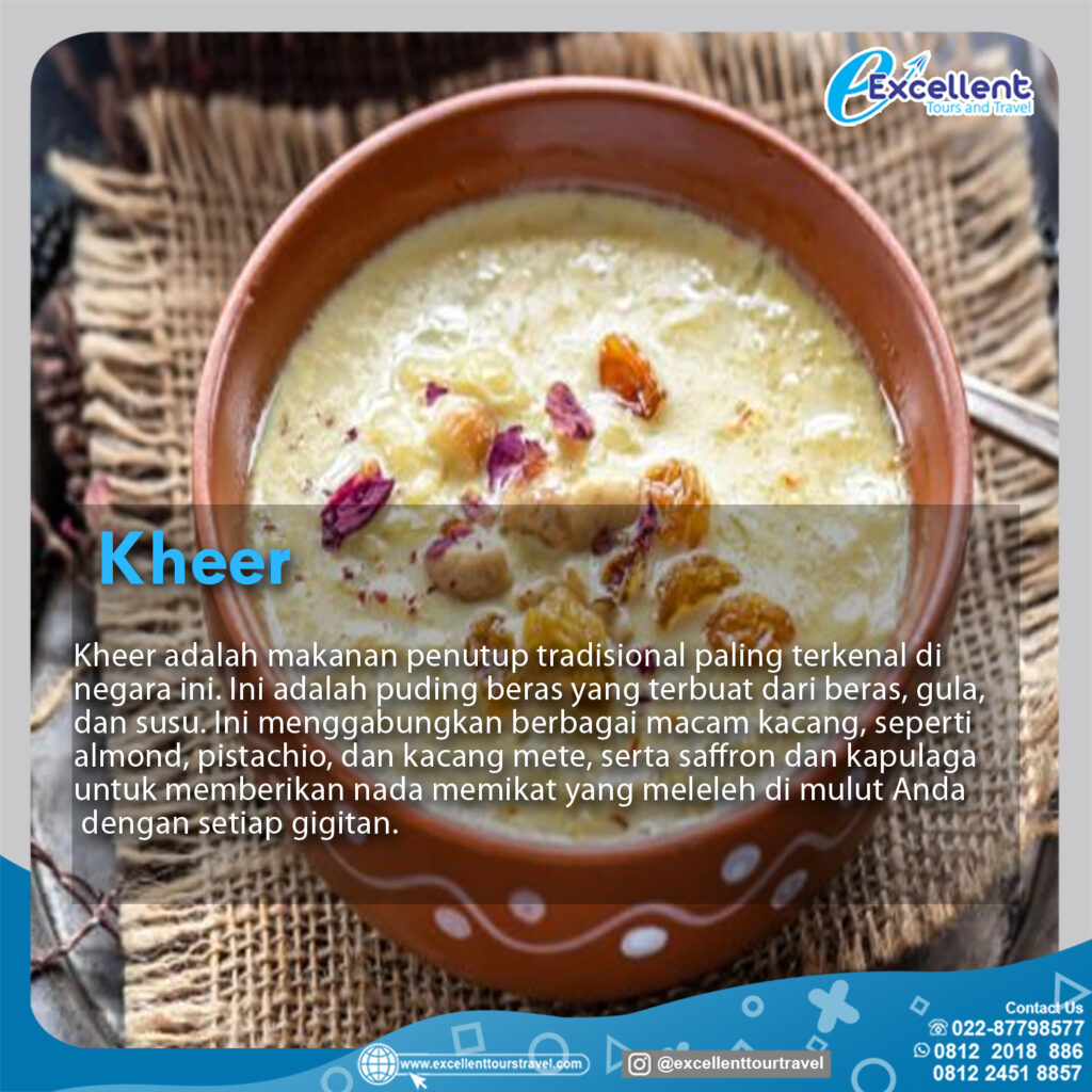 Kheer adalah makanan penutup tradisional paling terkenal di negara ini.Ini adalah pudding beras yang terbuat dari beras,gula,dan susu.Ini menggabungkan berbagai macam kacang,seperti almond,pistachio,dan kacang mete,serta saffron dan kapulaga untuk memberikan nada memikat yang meleleh di mulut Anda dengan setiap gigitan.