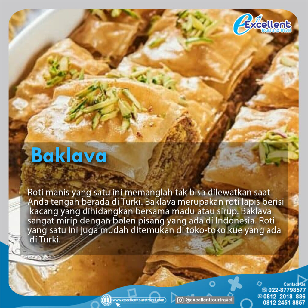 Roti manis yang satu ini memanglah tak bisa dilewatkan saat anda tengah berada di Turki.Baklava merupakan roti lapis berisi kacang yang di hidangkan bersama madu atau sirup.Baklava sangat mirip dengan bolen pisang yang ada di indonesia.Roti yang satu ini juga mudah ditemukan di toko-toko kue yang ada di Turki.