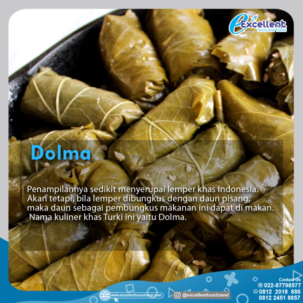 Penampilannya sedikit menyerupai lemper khas Indonesia.Akan tetapi,bila lemper di bungkus dengan daun pisang,Maka daun sebagai pembungkus makanan ini dapat dimakan.Nama kuliner khas turki ini yaitu Dolma.