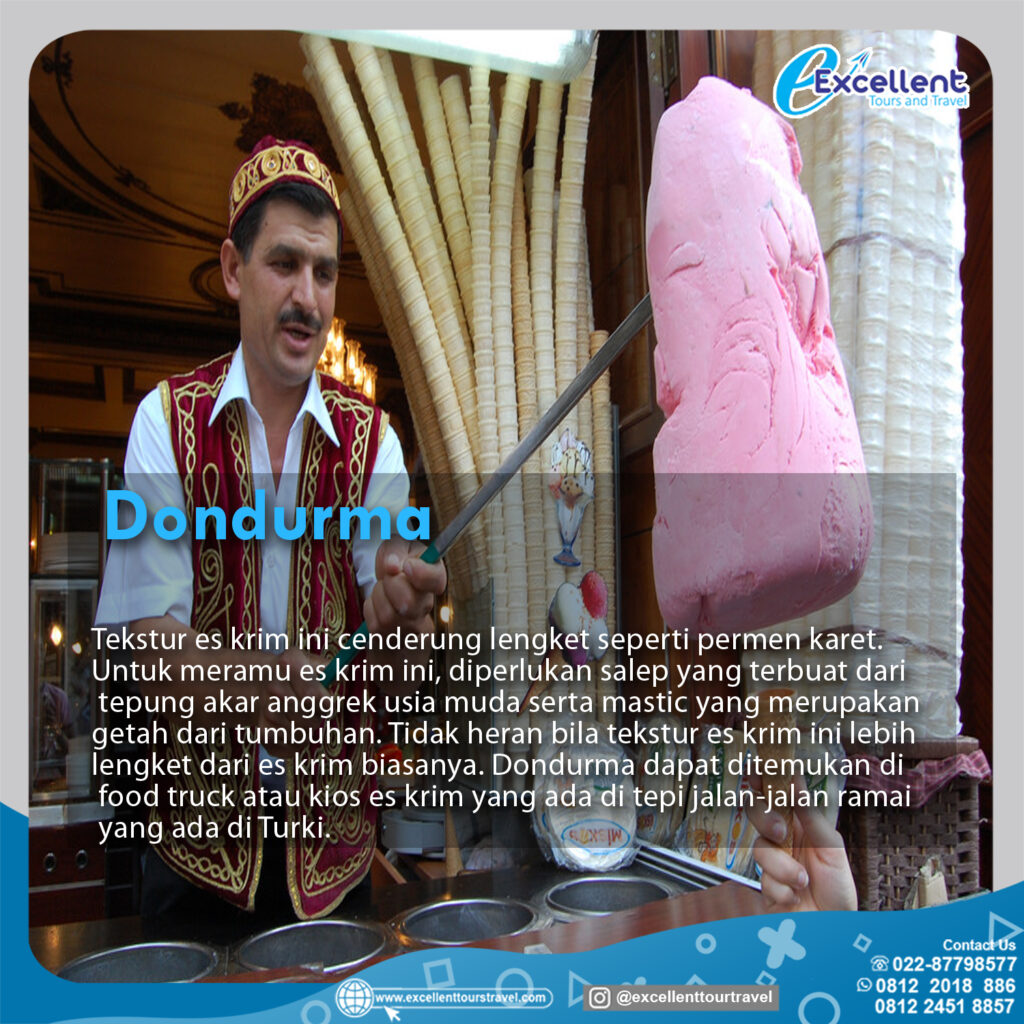 Tekstur es krim ini cenderung lengket seperti permen karet.Untuk meramu es krim ini,di perlukan salep yang terbuat dari tepung akar anggrek usia muda serta mastic yang merupakan getah dari tumbuhan.Tidak heran bila tekstur es krim ini lebih lengket dari es krim biasannya.Dondurma dapat di temukan di food truck atau kios es krim yang ada di tepi jalan-jalan ramai yang ada di Turki.