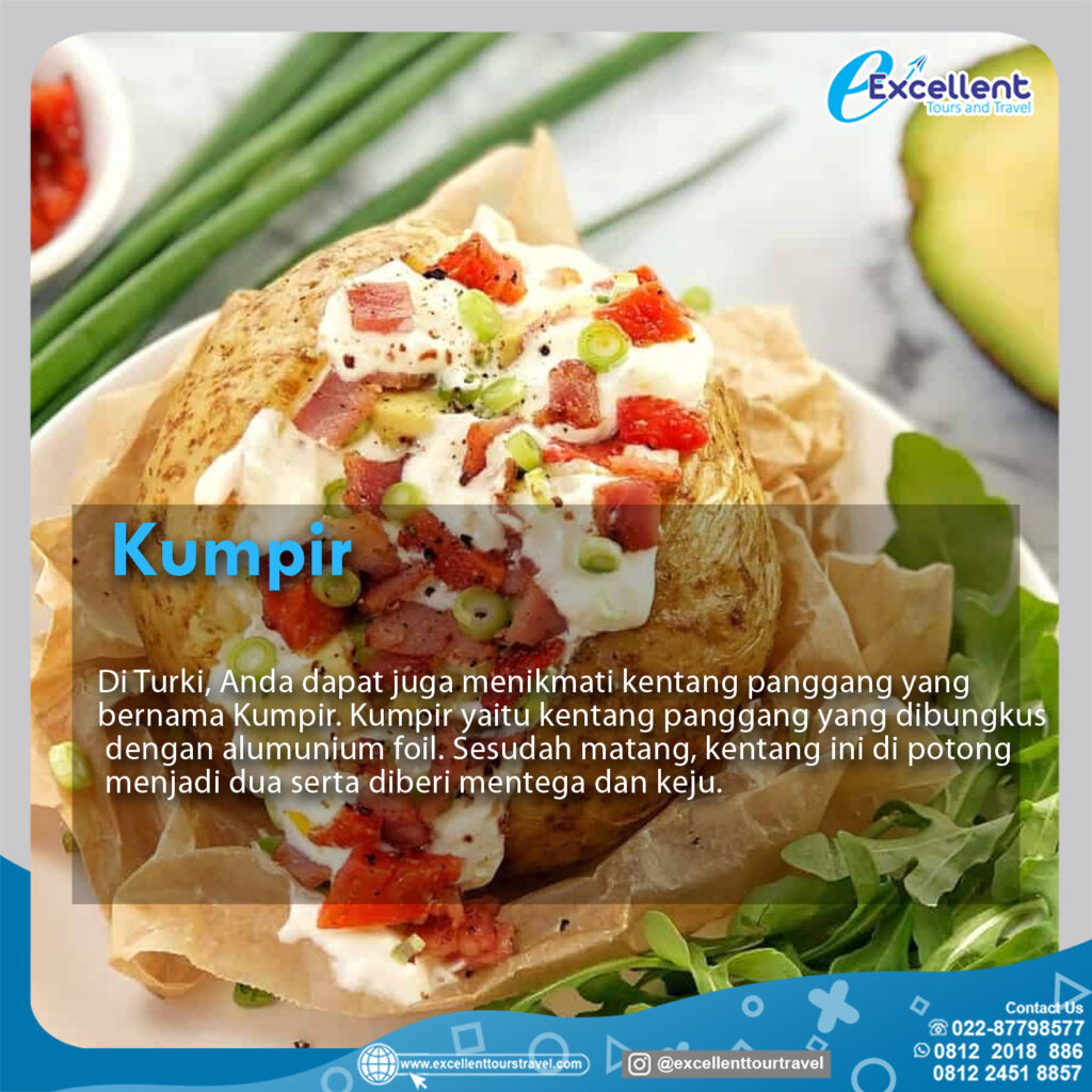 Di Turki,anda dapat juga menikmati kentang panggang yang bernama Kumpir.Kumpir yaitu kentang panggang yang di bungkus dengan alumunium foil.Sesudah matang,kentang ini di potong menjadi dua serta di beri mentega dan keju.