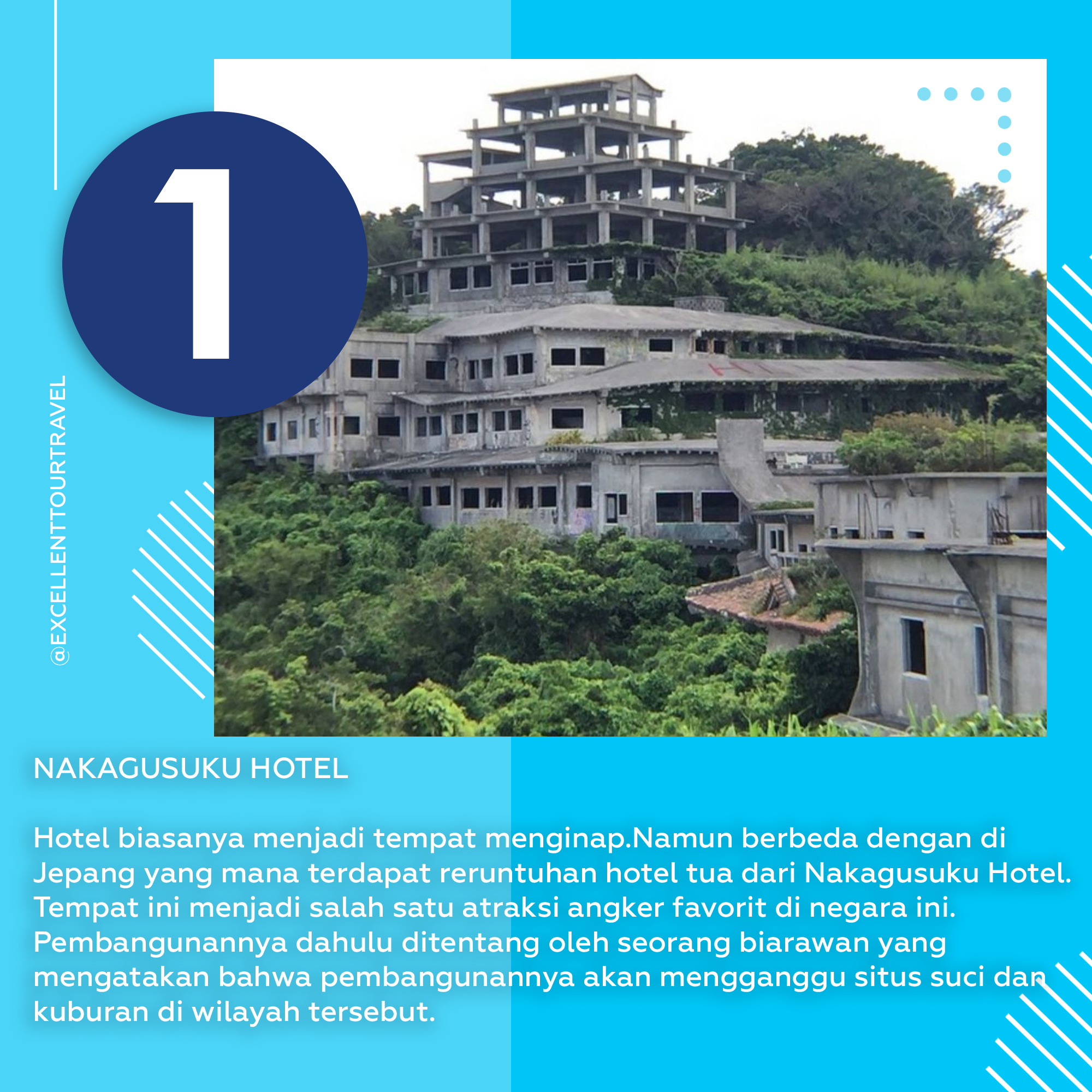 Hotel biasanya menjadi tempat menginap.Namun berbeda dengan di Jepang yang mana terdapat reruntuhan hotel tua dari Nakagusuku Hotel.Tempat ini menjadi salah satu atraksi angker favorit di negara ini.Pembangunannya dahulu ditentang oleh seorang biarawan yang mengatakan bahwa pembangunannya akan mengganggu situs suci dan kuburan di wilayah tersebut.Tetapi karena keserakahan kapitalis yang mengambil alih,mereka mulai melakukan pembangunan.Akibatnya terjadi beberapa kecelakaan dan kematian pekerja sehingga kemudian konstruksi dihentikan.