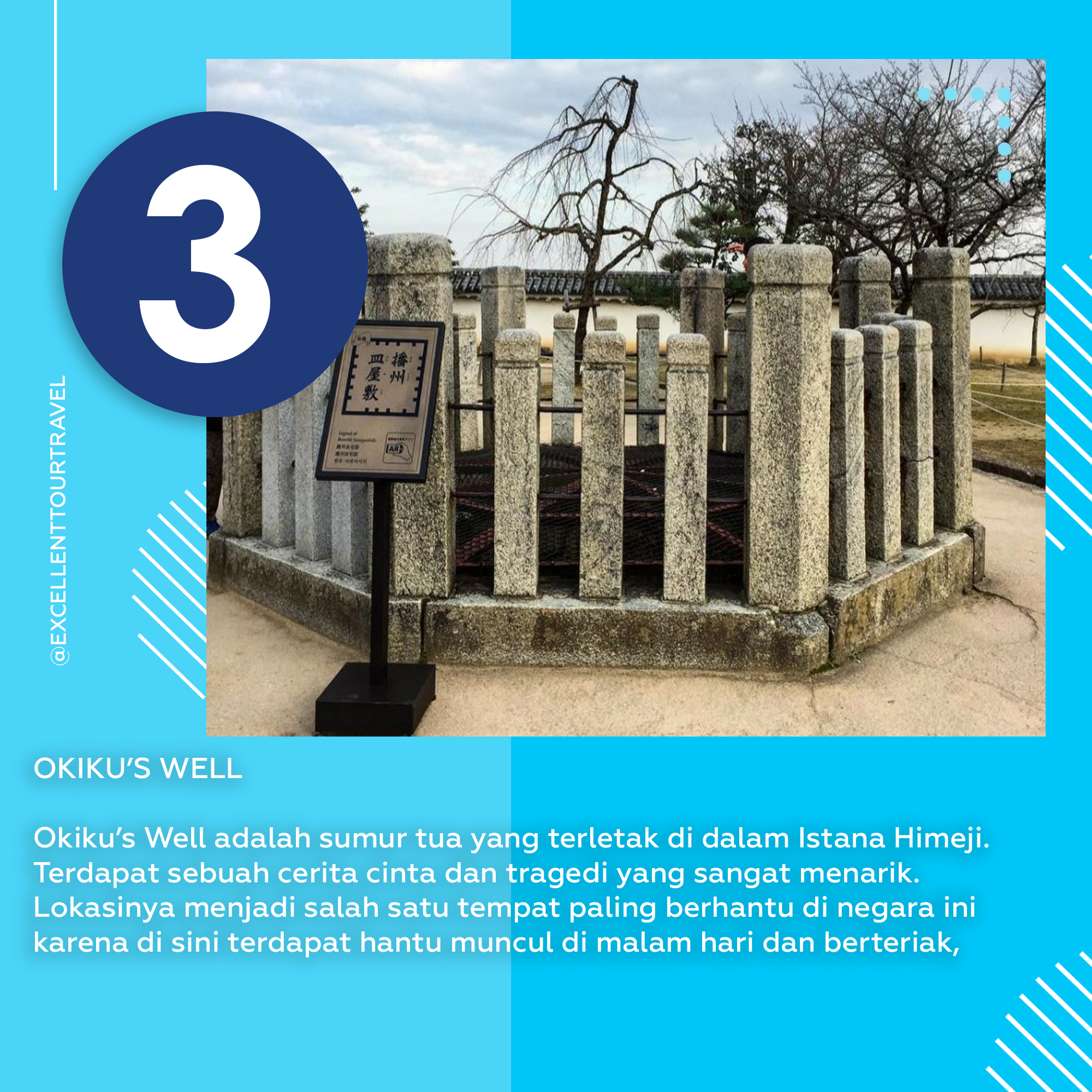 Okiku’s Well adalah sumur tua yang terletak di dalam Istana Himeji. Terdapat sebuah cerita cinta dan tragedi yang sangat menarik. Lokasinya menjadi salah satu tempat paling berhantu di negara ini karena di sini terdapat hantu muncul di malam hari dan berteriak.