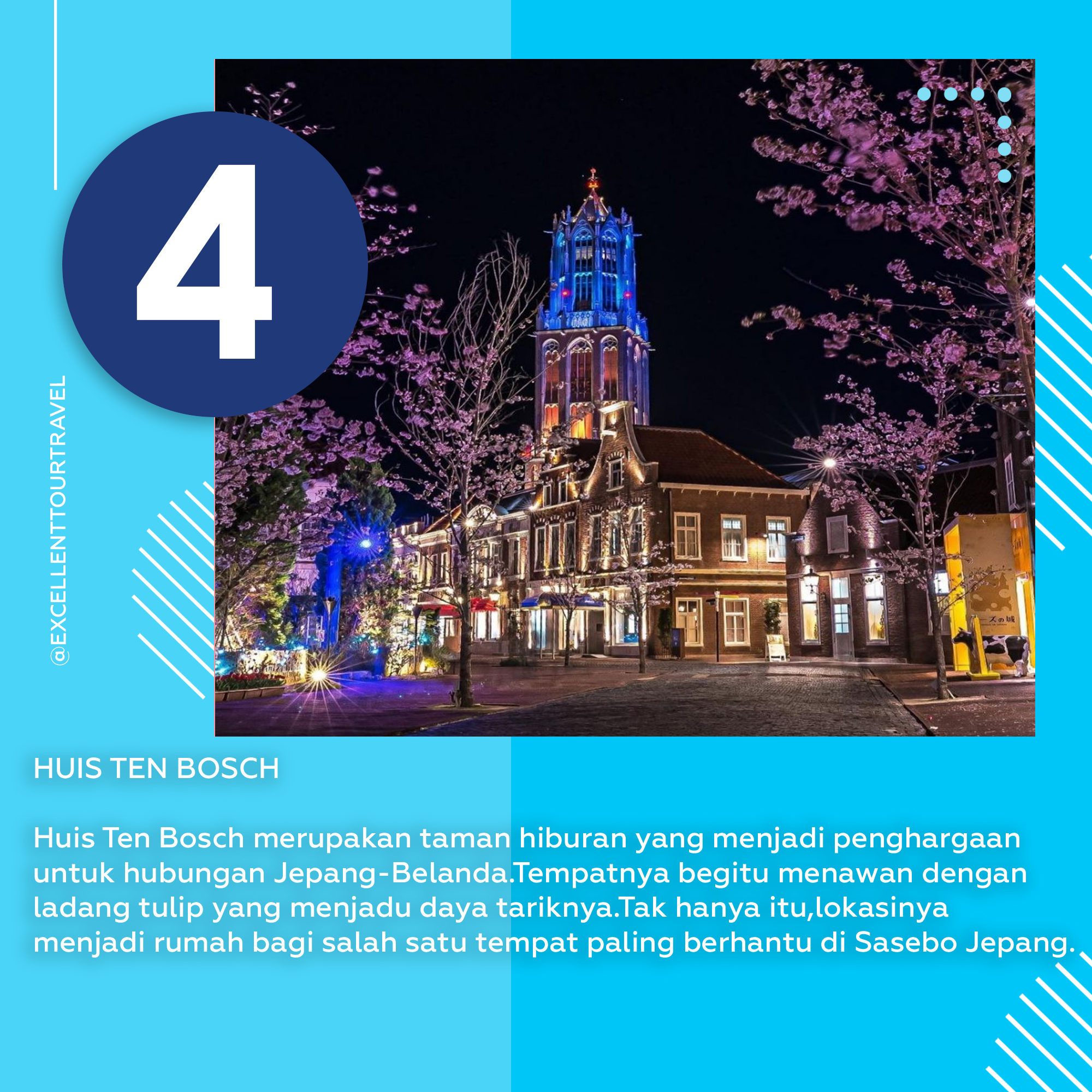 Huis Ten Bosch merupakan taman hiburan yang menjadi penghargaan untuk hubungan Jepang-Belanda. Tempatnya begitu menawan dengan ladang tulip yang menjadi daya tariknya. Tak hanya itu, lokasinya menjadi rumah bagi salah satu tempat paling berhantu di Sasebo Jepang.