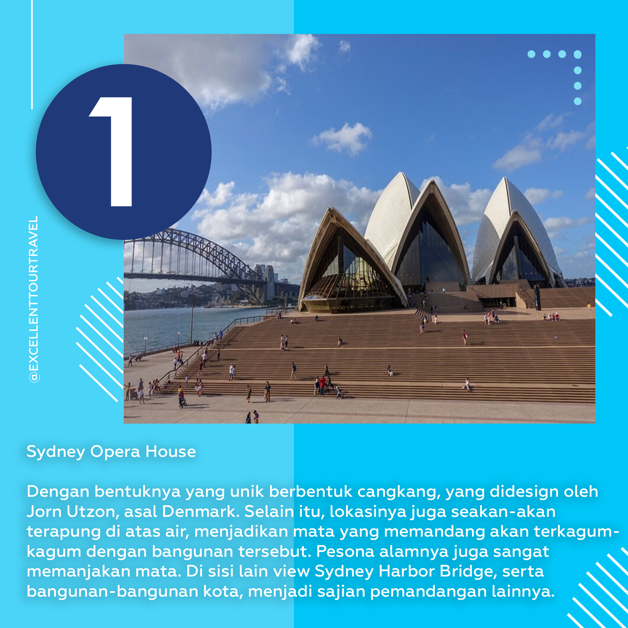 Bagi negara Indonesia, tempat wisata di Australia menjadi salah-satu destinasi luar negeri yang sering dikunjungi.Β Dekat, sebagai negara, dan benua tetangga, adalah beberapa alasan dari sekian banyak alasan kunjungan wisata ke Australia. Wisata di Australia juga bukan hanya sebatas bertemakan wisata alam. Ada juga wisata yang romantis, dan instagramable, hingga wisata sejarah yang recommended untuk dikunjungi.