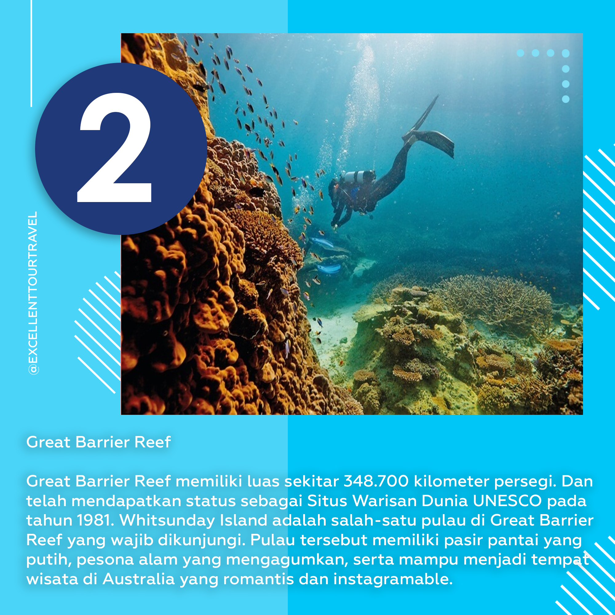 Tahukah anda dimana letak terumbu karang terbesar di dunia? Yups, jawabannya terletak di Queensland, Australia, yang bernama Great Barrier Reef. Great Barrier Reef memiliki luas sekitar 348.700 kilometer persegi. Dan telah mendapatkan status sebagai Situs Warisan Dunia UNESCO pada tahun 1981. Saat situasi pandemi reda, saya sarankan kunjungan wisata ke Great Barrier Reef Australia menjadi list nomor 1. Karena tempat wisata di Australia tersebut terancam punah di tahun 2030. Adapun aktivitas wisata yang bisa dilakukan di Great Barrier Reef adalah Berlayar, Menaiki kapal layar lantai kaca, Snorkeling, Jet ski, Hingga skydive. Whitsunday Island adalah salah-satu pulau di Great Barrier Reef yang wajib dikunjungi. Pulau tersebut memiliki pasir pantai yang putih, pesona alam yang mengagumkan, serta mampu menjadi tempat wisata di Australia yang romantis dan instagramable. - Kangoroo Island