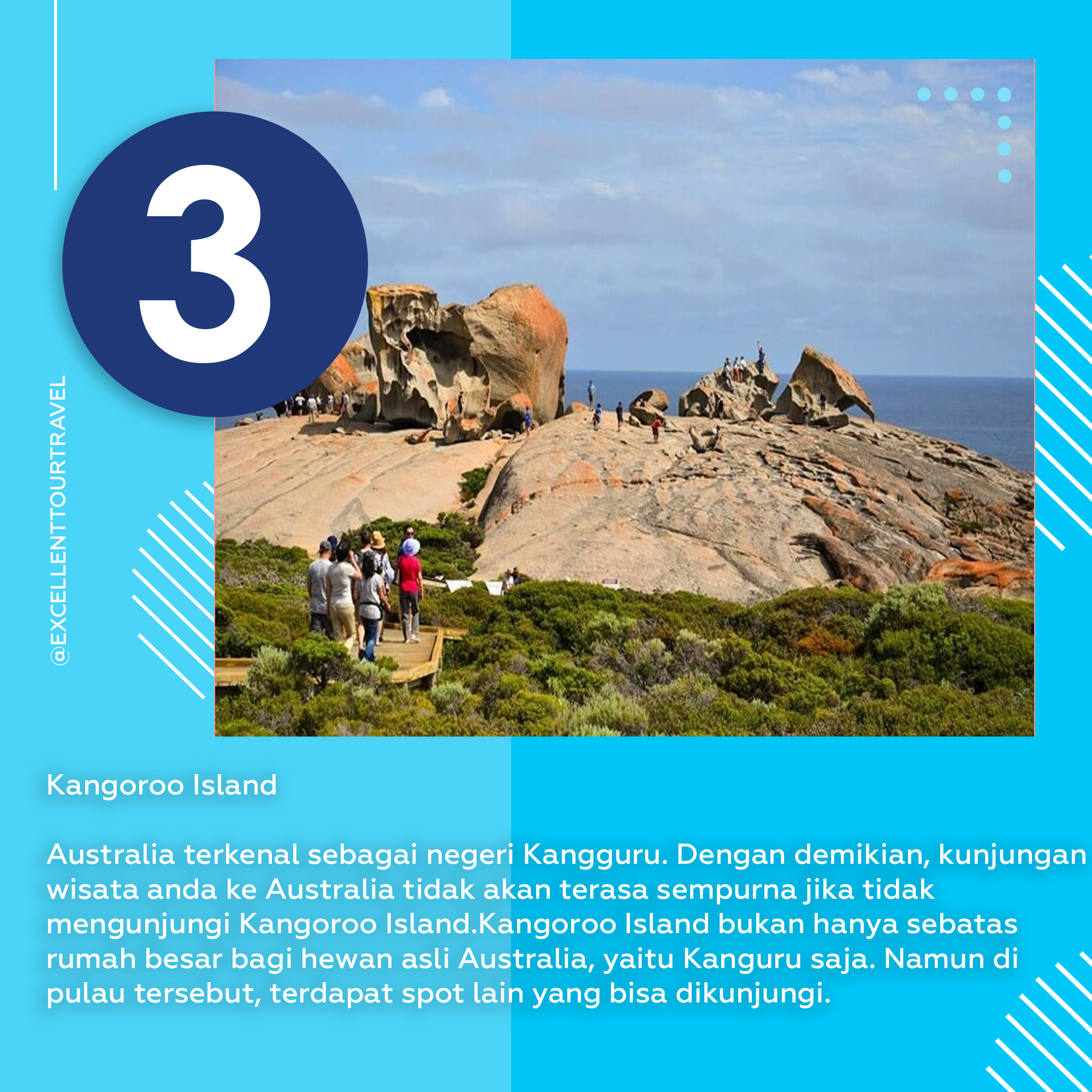 Australia terkenal sebagai negeri Kangguru. Dengan demikian, kunjungan wisata anda ke Australia tidak akan terasa sempurna jika tidak mengunjungi Kangoroo Island. Kangoroo Island bukan hanya sebatas rumah besar bagi hewan asli Australia, yaitu Kanguru saja. Namun di pulau tersebut, terdapat spot lain yang bisa dikunjungi, yaitu Taman Nasional Flinders Chase, Remarkable Rocks, dan Taman Konservasi Kelly Hill. - Cable Beach