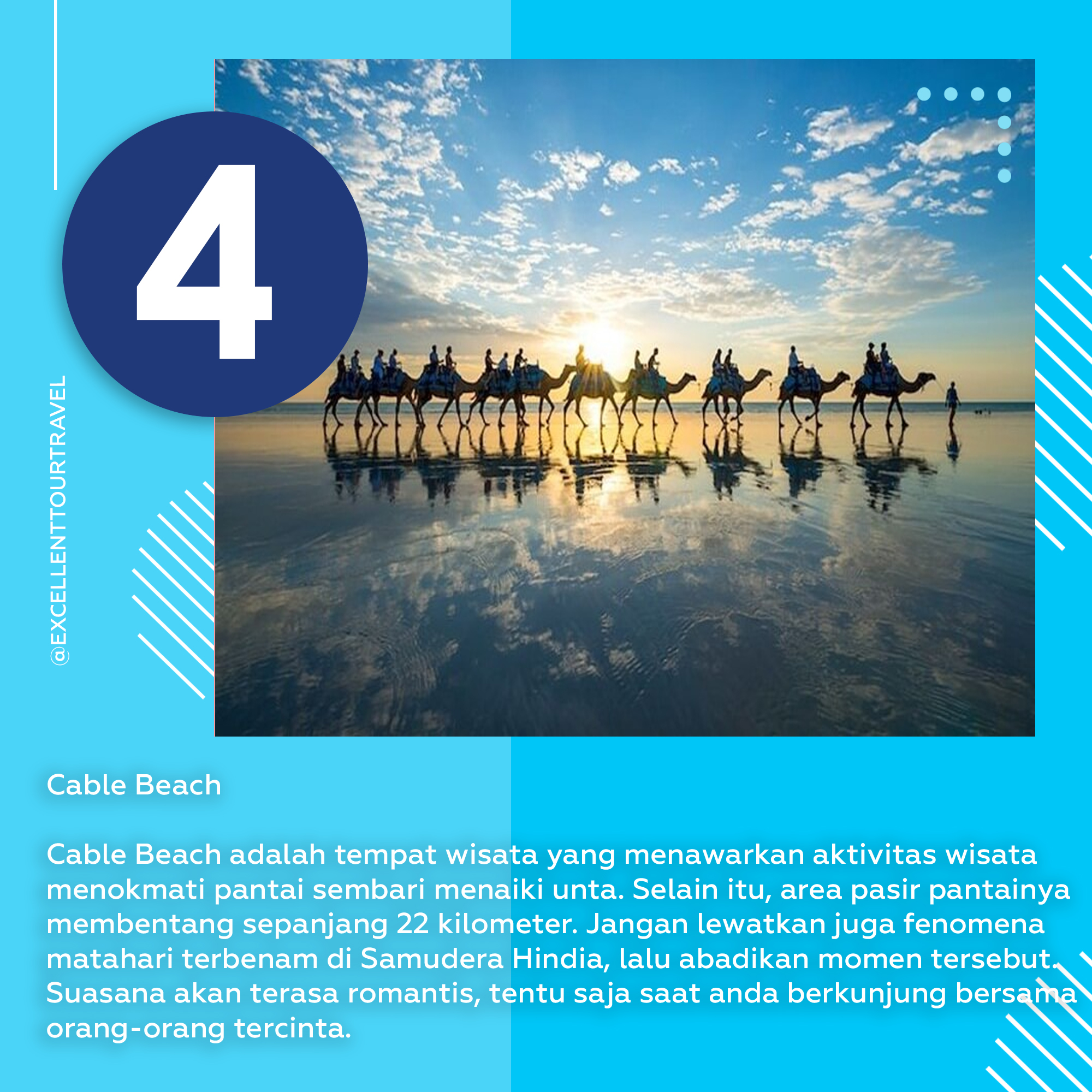 Pantai dengan air laut yang biru, pasir putih, itu mungkin saja rata-rata daya tarik dari tempat wisata alam pantai. Tapi oernahkah anda berjalan β jalan di sekitar area pantai dengan menunggangi unta? Jika belum, maka Cable Beach adalah tempat wisata yang menawarkan aktivitas wisata tersebut. Selain itu, area pasir pantainya membentang sepanjang 22 kilometer. Jangan lewatkan juga fenomena matahari terbenam di Samudera Hindia, lalu abadikan momen tersebut. Suasana akan terasa romantis, tentu saja saat anda berkunjung bersama orang-orang tercinta. - The Ghan