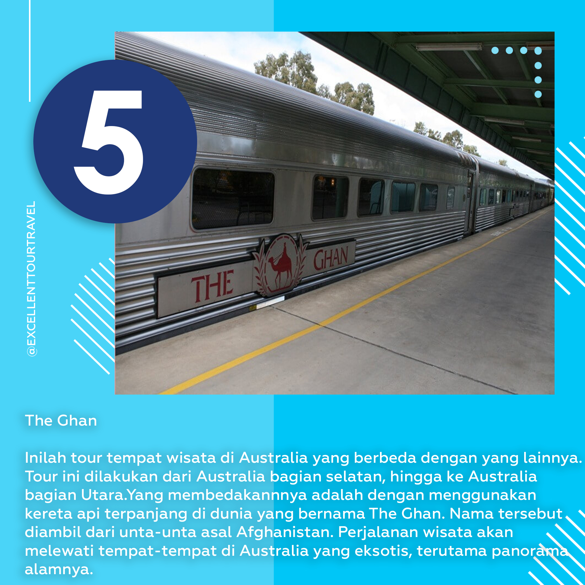 Inilah tour tempat wisata di Australia yang berbeda dengan yang lainnya. Tour ini dilakukan dari Australia bagian selatan, hingga ke Australia bagian Utara. Yang membedakannnya adalah dengan menggunakan kereta api terpanjang di dunia yang bernama The Ghan. Nama tersebut diambil dari unta-unta asal Afghanistan. Perjalanan wisata akan melewati tempat-tempat di Australia yang eksotis, terutama panorama alamnya. Tentu saja, paket wisata The Ghan bukan dalam hitungan jam, melainkan hari.
