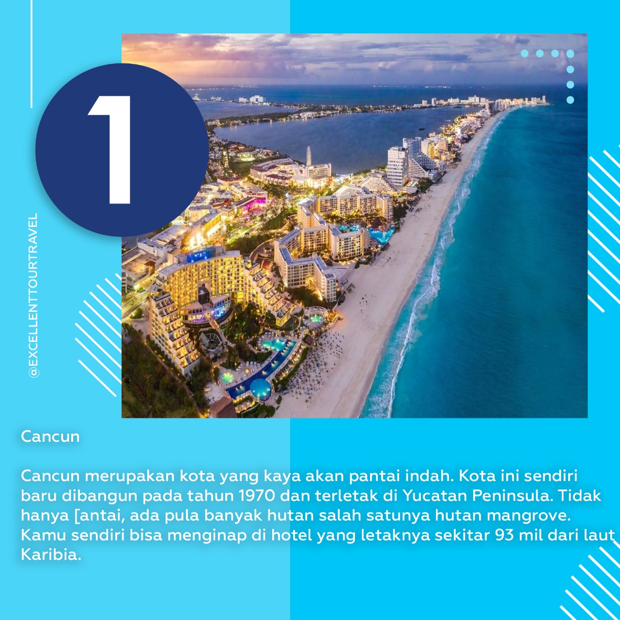 Cancún merupakan kota yang kaya akan pantai indah. Kota ini sendiri baru dibangun pada tahun 1970 dan terletak di Yucatán Peninsula. Tidak hanya pantai, ada pula banyak hutan salah satunya hutan mangrove. Kamu sendiri bisa menginap di hotel yang letaknya sekitar 93 mil dari laut Karibia. Cancún sendiri menjadi destinasi wisata paling populer di Meksiko. Sehingga rasanya kurang jika kamu pergi ke Meksiko tanpa mampir ke Cancún. - Isla Holbox