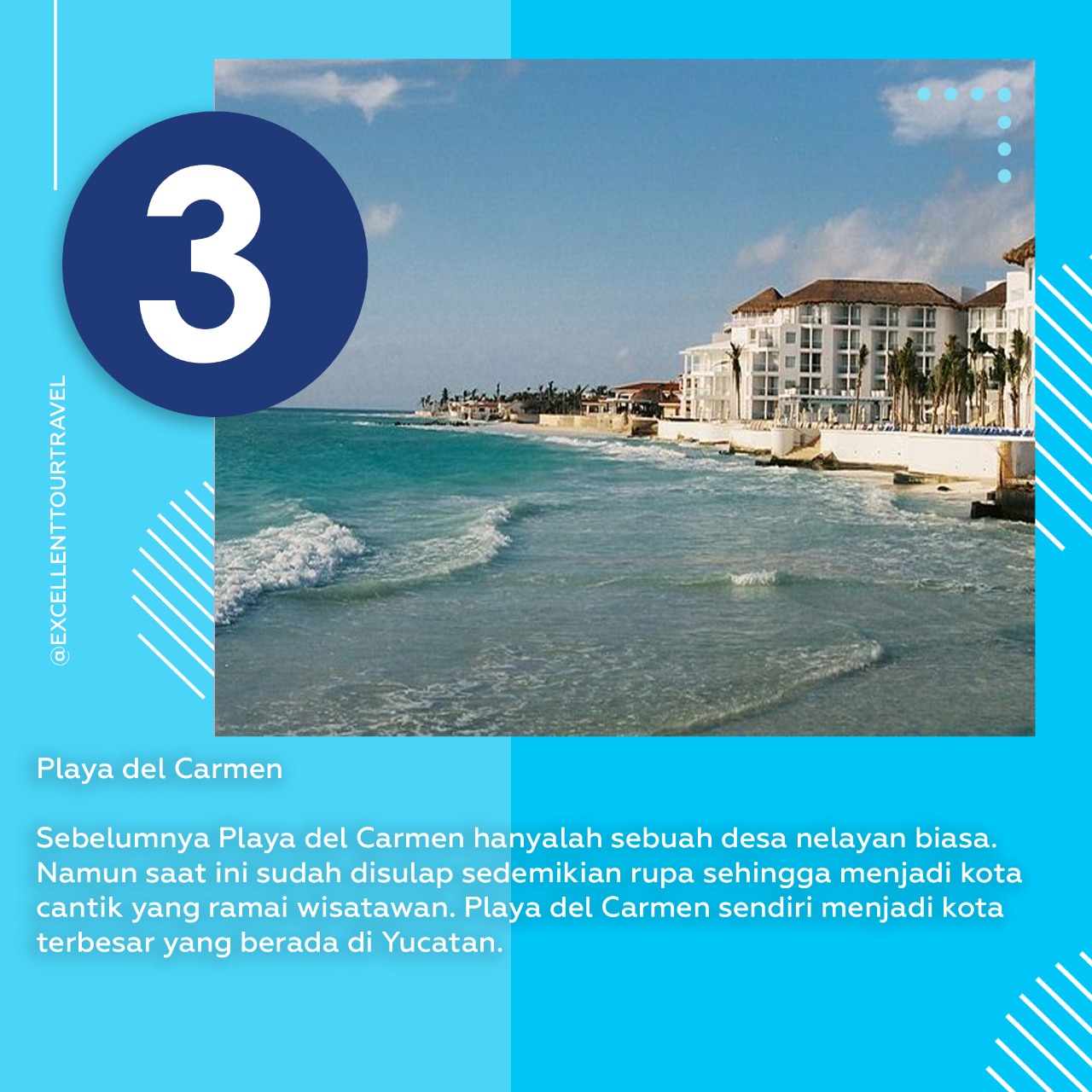 Sebelumnya Playa del Carmen hanyalah sebuah desa nelayan biasa. Namun saat ini sudah disulap sedemikian rupa sehingga menjadi kota cantik yang ramai wisatawan. Playa del Carmen sendiri menjadi kota terbesar yang berada di Yucatán. Infrastruktur yang dibangun disini juga tergolong megah dan mewah. Saat mengunjungi pantai, kamu bisa membeli Taco yang dijual murah di area sekitar pantai. - Tulum