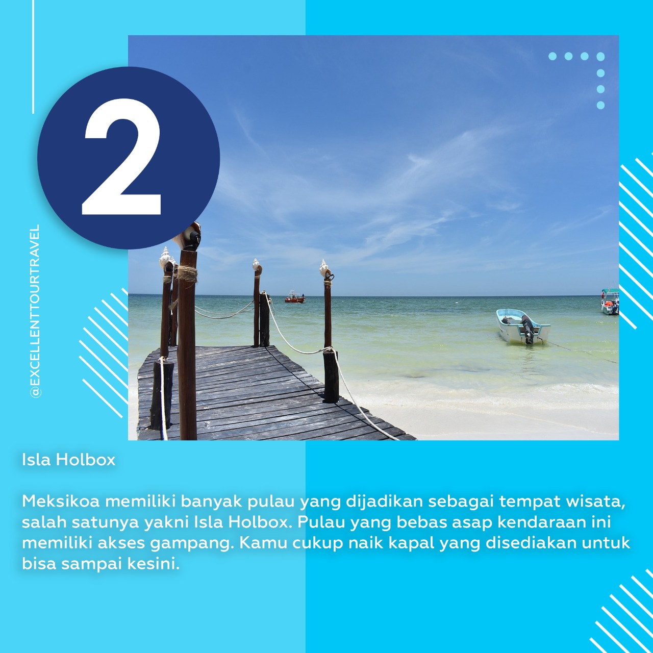 Meksiko memiliki banyak pulau yang dijadikan sebagai tempat wisata, salah satunya yakni Isla Holbox. Pulau yang bebas asap kendaraan ini memiliki akses gampang. Kamu cukup naik kapal yang disediakan untuk bisa sampai kesini. Pulau ini sering dikunjungi wisatawan yang menginginkan suasana tenang tanpa adanya polusi yang menganggu. Apalagi terdapat banyak bangunan instagramable di Isla Holbox. - Playa del Carmen