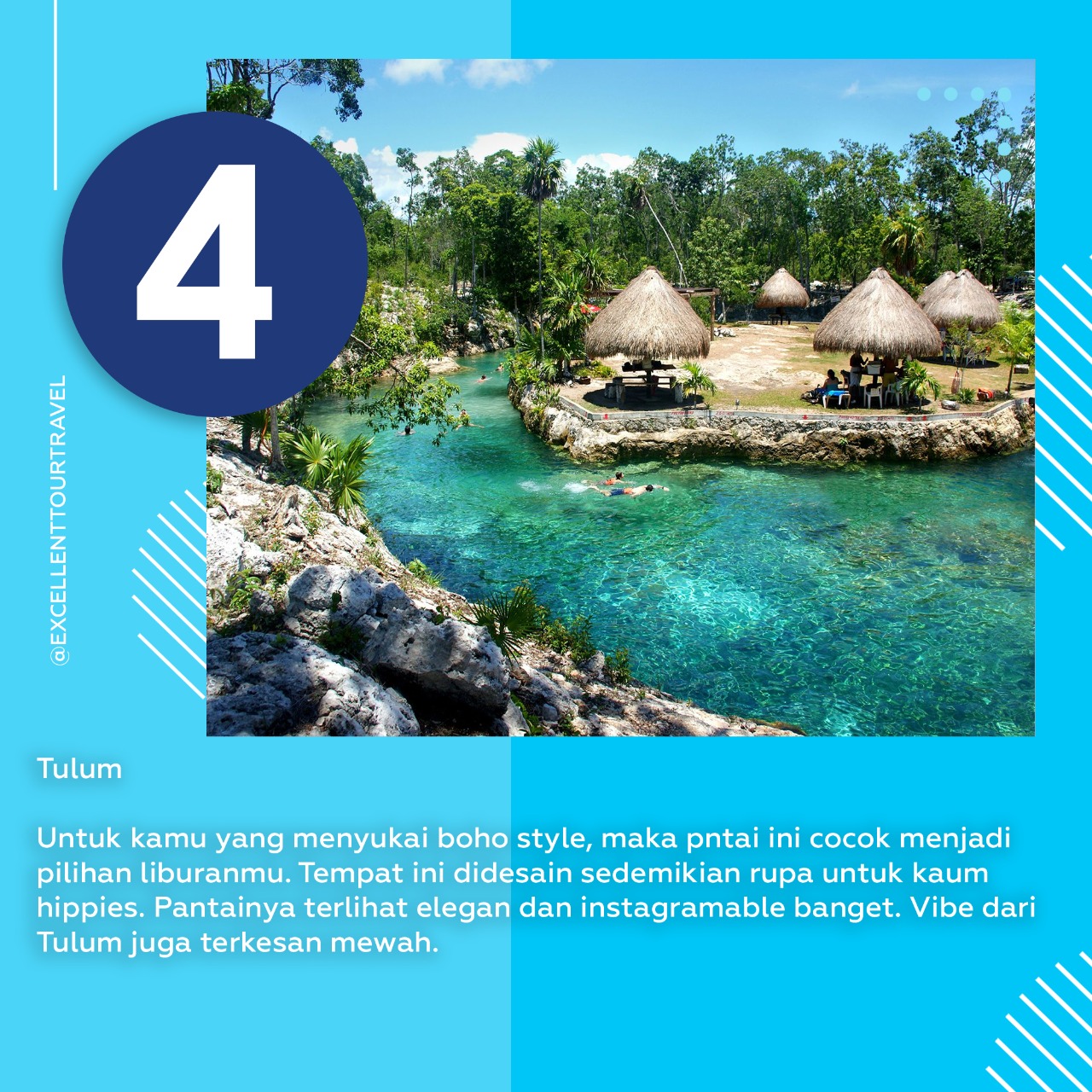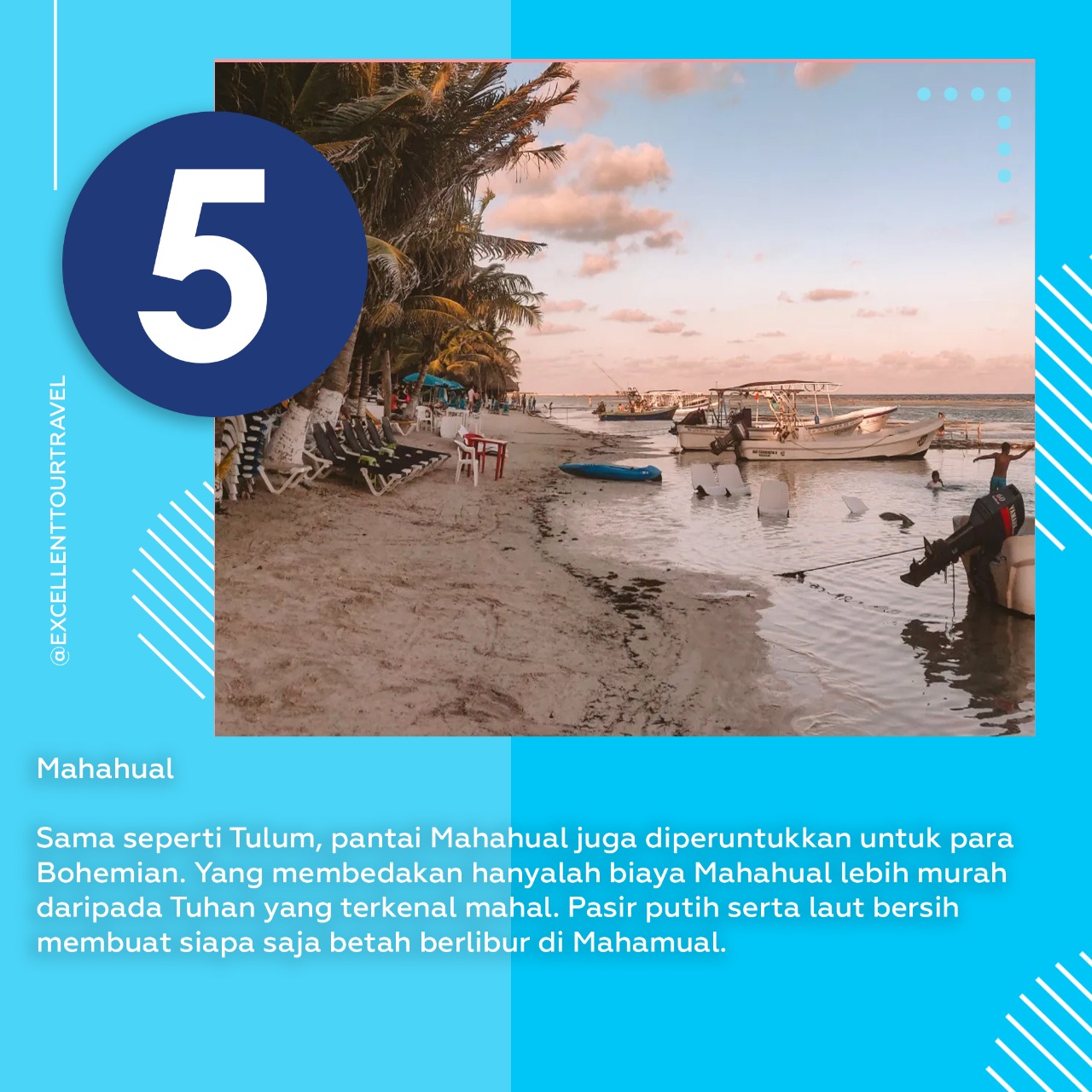Untuk kamu yang menyukai boho style, maka pantai ini cocok untuk menjadi pilihan liburanmu. Tempat ini didesain sedemikian rupa untuk kaum hippies. Pantainya terlihat elegan dan instagramable banget. Vibe dari Tulum juga terkesan mewah. Di Tulum terdapat banyak butik yang menjual pakaian bertema boho serta restoran yang menyediakan makanan organik. - Mahahual