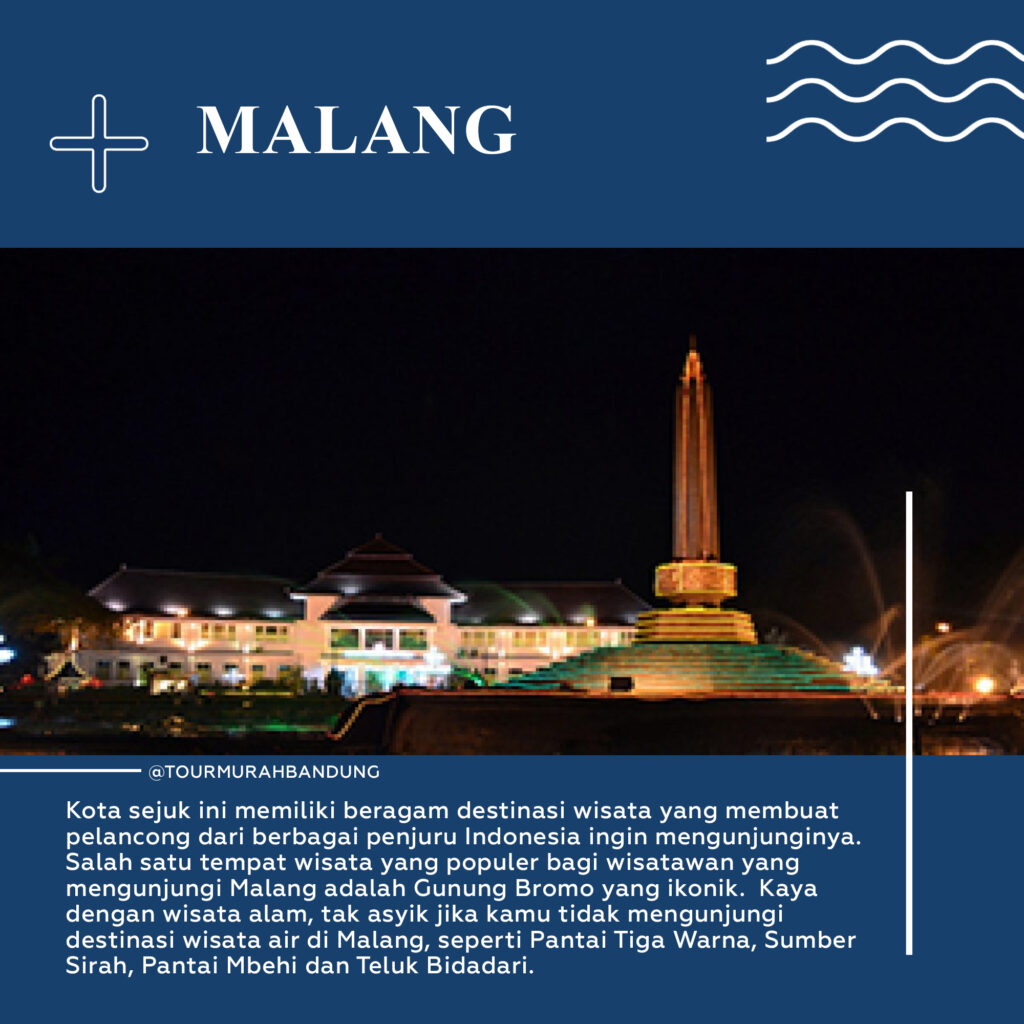 Kota sejuk ini memiliki beragam destinasi wisata yang membuat pelancong dari berbagai penjuru Indonesia ingin mengunjunginya. Salah satu tempat wisata yang populer bagi wisatawan yang mengunjungi Malang adalah Gunung Bromo yang ikonik. Kaya dengan wisata alam, tak asyik jika kamu tidak mengunjungi destinasi wisata air di Malang, seperti Pantai Tiga Warna, Sumber Sirah, Pantai Mbehi dan Teluk Bidadari.