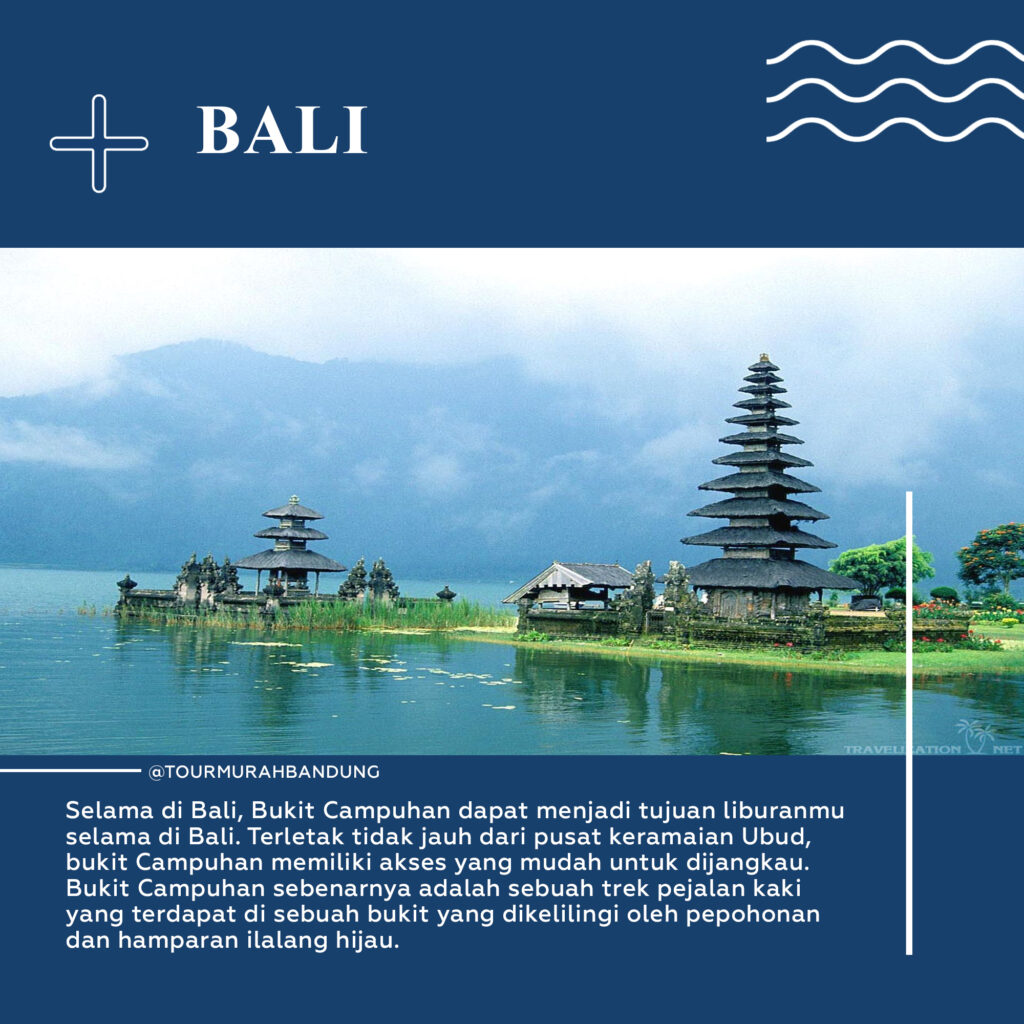 Selama di Bali, Bukit Campuhan dapat menjadi tujuan liburanmu selama di Bali. Terletak tidak jauh dari pusat keramaian Ubud, bukit Campuhan memiliki akses yang mudah untuk dijangkau. Bukit Campuhan sebenarnya adalah sebuah trek pejalan kaki yang terdapat di sebuah bukit yang dikelilingi oleh pepohonan dan hamparan ilalang hijau.