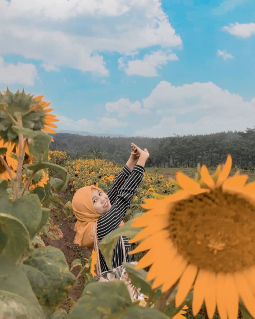 Datanglah saat hari manis cerah, bunga akan bermekaran bersamaan, sehingga bakal jadi spot foto yang estetik. Tempat wisata ini dikelilingi perbukitan hijau, lho.
