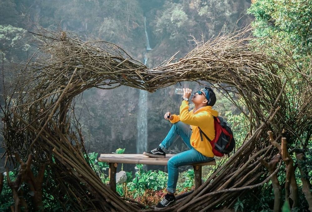 Di sekitar air terjun terdapat beberapa ornamen yang dibuat warga setempat untuk jadi spot berfoto. Saat perjalanan menuju air terjun kamu harus berhati-hati, karena kondisi jalan yang cukup ekstrem.