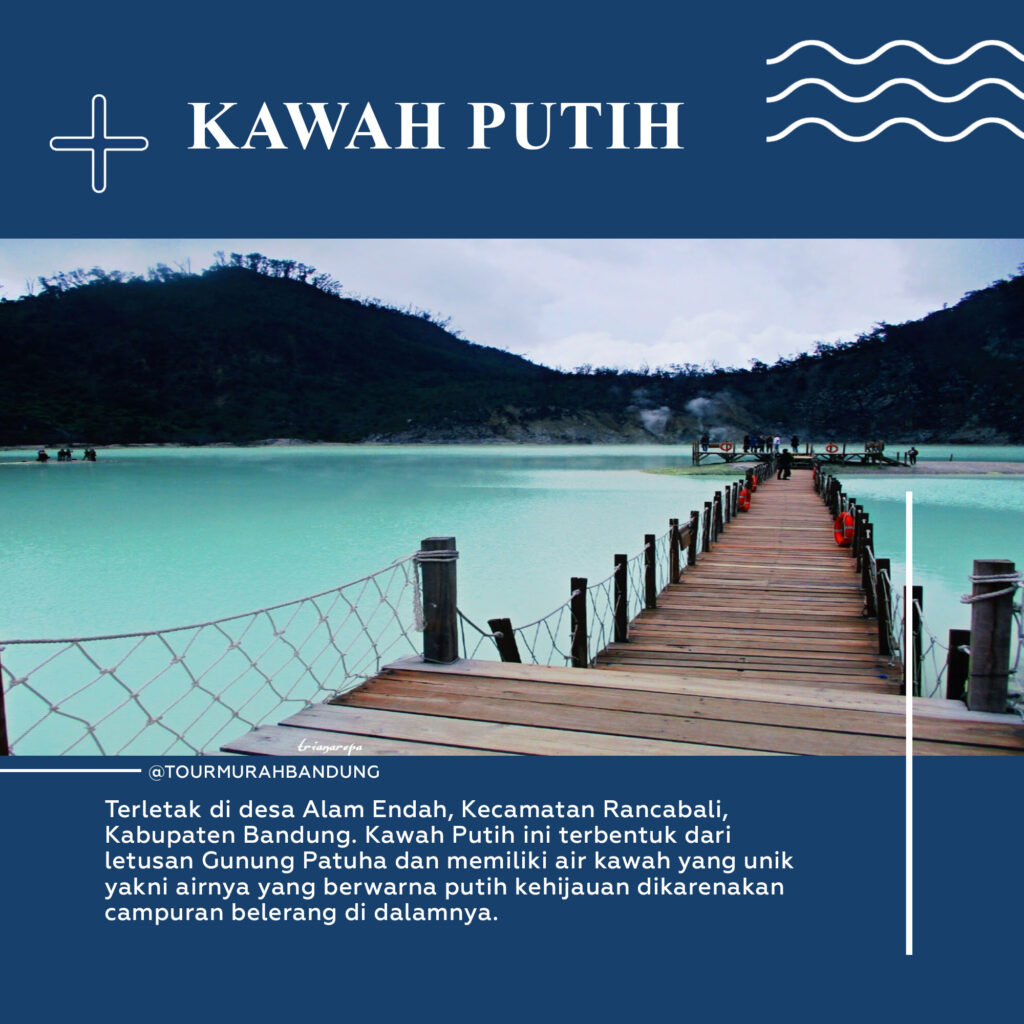 Terletak di desa Alam Endah, Kecamatan Rancabali, Kabupaten Bandung. Kawah Putih ini terbentuk dari letusan Gunung Patuha dan memiliki air kawah yang unik yakni airnya yang berwarna putih kehijauan dikarenakan campuran belerang di dalamnya.