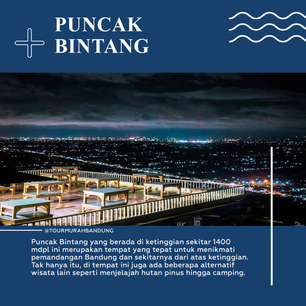 Puncak Bintang yang berada di ketinggian sekitar 1400 mdpl ini merupakan tempat yang tepat untuk menikmati pemandangan Bandung dan sekitarnya dari atas ketinggian. Tak hanya itu, di tempat ini juga ada beberapa alternatif wisata lain seperti menjelajah hutan pinus hingga camping.