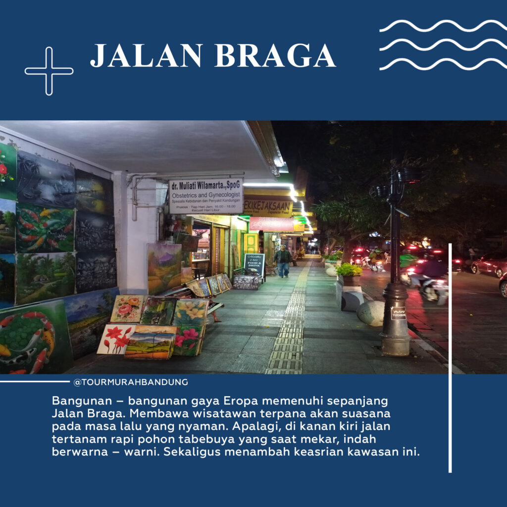 Bangunan β bangunan gaya Eropa memenuhi sepanjang Jalan Braga. Membawa wisatawan terpana akan suasana pada masa lalu yang nyaman. Apalagi, di kanan kiri jalan tertanam rapi pohon tabebuya yang saat mekar, indah berwarna β warni. Sekaligus menambah keasrian kawasan ini.