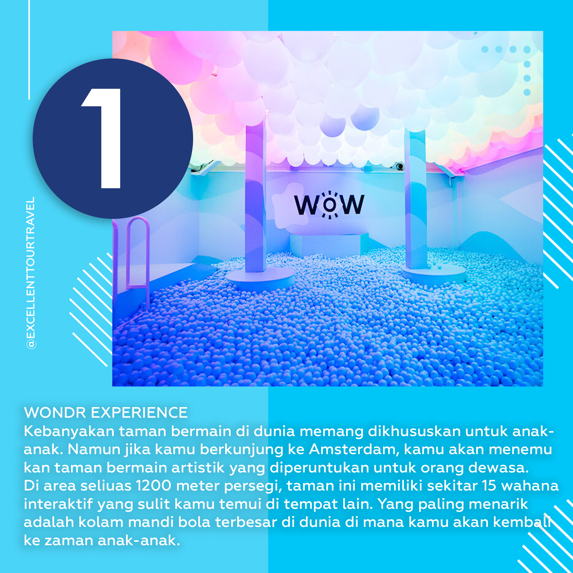 Museum Instagram yang imersif di Amsterdam ini adalah perpaduan magis antara hiburan dan seni yang terletak di bagian utara kota, jantung kreatif Amsterdam. Dirancang bersama dengan beberapa seniman paling kreatif di kota ini, WONDR adalah taman bermain dengan pengalaman unik yang belum pernah Anda lihat sebelumnya! Lebih dari 15 kamar yang menarik dan menyenangkan mengundang Anda untuk melakukan petualangan yang mempesona untuk dimainkan, dibagikan, dan dijelajahi. Rasakan seni bermain dan rasakan hal-hal yang menjadi impian! Sangat visual dan sangat interaktif, taman bermain artistik ini menawarkan 1200m² penuh dengan instalasi yang menggelitik semua indra Anda dan lingkungan desain fotogenik yang pasti akan memicu imajinasi Anda dalam sekejap mata. Tersesat di hutan dunia lain dan selami kolam marshmallow merah muda, lompat ke lubang bola terbesar yang pernah Anda lihat, peluk boneka beruang raksasa atau menari di bawah langit yang berkilauan. Museum Instagram Amsterdam mengundang Anda untuk bermain dan mengeksplorasi kreativitas Anda, berapa pun usia Anda! Ini adalah tempat yang ideal untuk membiarkan imajinasi Anda menjadi liar. Anda dapat menulis di dinding, bernyanyi sepenuh hati, dan berbaur dengan karya seni. WONDR memungkinkan Anda untuk melangkah ke dalam karya seni dan bahkan lukisan, menjadi bagian dari seni itu sendiri.