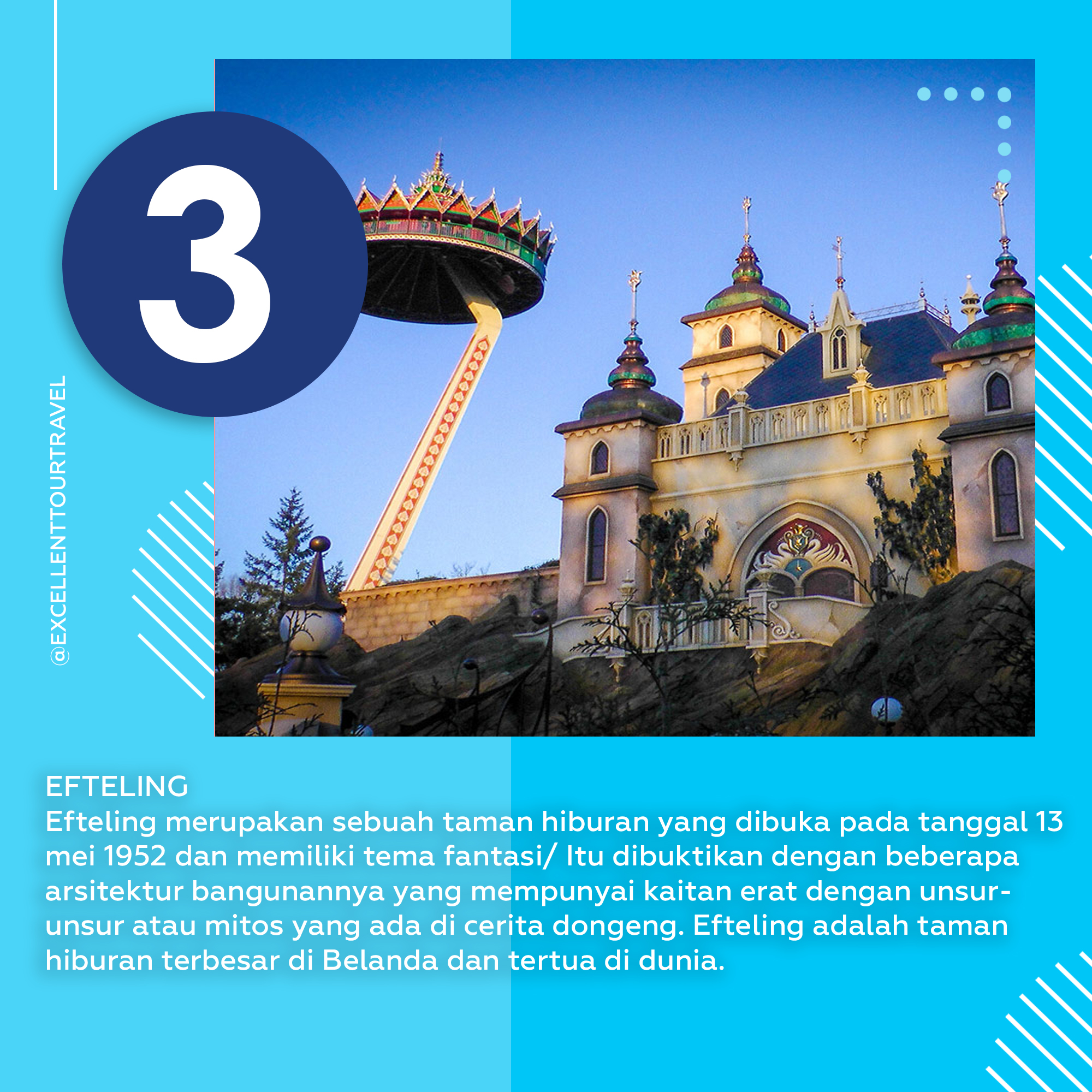 Efteling adalah taman hiburan bertema fantasi di Kaatsheuvel , Belanda . Atraksi mencerminkan unsur – unsur dari mitos dan legenda kuno , dongeng , fabel , dan cerita rakyat. Taman ini dibuka pada tanggal 31 Mei 1952. Taman ini berkembang dari taman alam dengan taman bermain dan Hutan Dongeng menjadi taman hiburan berukuran penuh. Sekarang melayani anak-anak dan orang dewasa dengan tema budaya, romantis, dan nostalgia, di samping beragam wahana hiburan termasuk enam roller coaster dan empat wahana gelap. Ini adalah taman hiburan terbesar di Belanda dan salah satu taman hiburan tertua di dunia. Ini dua kali lebih besar dari taman Disneyland asli di California dan mendahuluinya tiga tahun. Setiap tahun, taman ini memiliki lebih dari 5 juta pengunjung. Pada tahun 2020, itu adalah taman hiburan yang paling banyak dikunjungi di Eropa, sebelum Taman Disneyland (Paris).