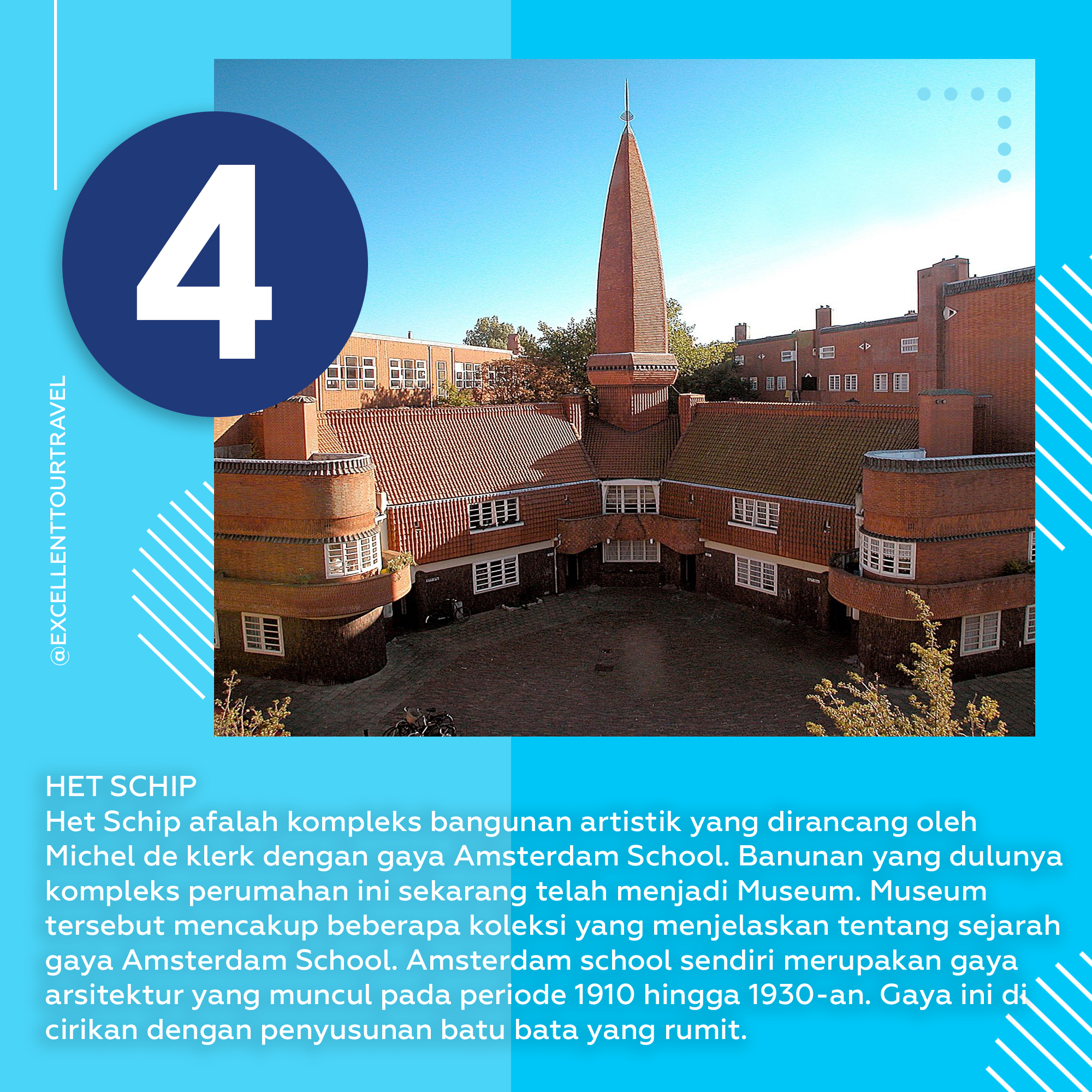 Ini adalah pemandangan ikonik di Amsterdam: kompleks perumahan umum merah-oranye di sepanjang Spaarndammerplantsoen. Dirancang oleh arsitek terkenal Michel de Klerk, bangunan ekspresionis ini menjadi tuan rumah Museum Het Schip (The Ship), yang membawa pengunjung dalam perjalanan melalui seni arsitektur. Konstruksi batu bata yang khas mengungkapkan bahwa The Ship adalah pameran gerakan arsitektur Sekolah Amsterdam. Muncul pada tahun 1910 hingga sekitar tahun 1930 di Belanda, gerakan terkenal ini membentuk kota-kota di seluruh negeri, cara membangunnya yang fantastis menjadi bahan pokok Amsterdam yang tidak dapat dilewatkan.