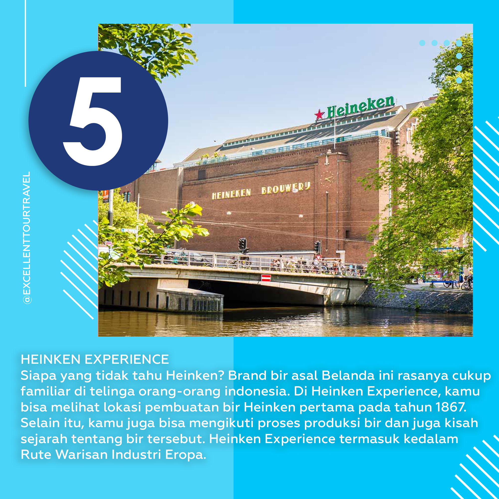 Heineken Experience yang terletak di Amsterdam adalah tempat pembuatan bir bersejarah dan pusat pengunjung perusahaan untuk pilsner Belanda yang didistribusikan secara internasional , bir Heineken. Fasilitas industri ini dibangun sebagai tempat pembuatan bir Heineken pertama pada tahun 1867, berfungsi sebagai fasilitas pembuatan bir utama perusahaan hingga tahun 1988 ketika fasilitas yang lebih modern dan lebih besar dibangun di pinggiran kota. Pada tahun 1991, tempat pembuatan bir dibuka untuk umum sebagai tur tempat pembuatan bir dan pusat pengunjung, yang dikenal sebagai “Pusat Perawatan dan Informasi Heineken” (Meskipun “Pengalaman” Heineken dimulai pada tahun 1991, ada tur tempat pembuatan bir asli saat masih sepenuhnya operasional.) ( Belanda : Heineken ontvangst- en informatiecentrum ). Daya tarik tersebut berkembang menjadi salah satu tempat wisata paling populer di Amsterdam dan pada tahun 2001 pusat pengunjung berubah nama menjadi “Heineken Experience”. Setelah satu tahun renovasi dan perluasan ekstensif, Heineken Experience dibuka kembali untuk pengunjung pada 3 November 2008. Transformasi terbaru dari pengalaman pengunjung terdiri dari empat tingkat artefak sejarah, eksplorasi dan pengambilan sampel produk, dan pameran interaktif yang menggunakan teknologi tinggi terbaru. teknologi multimedia.