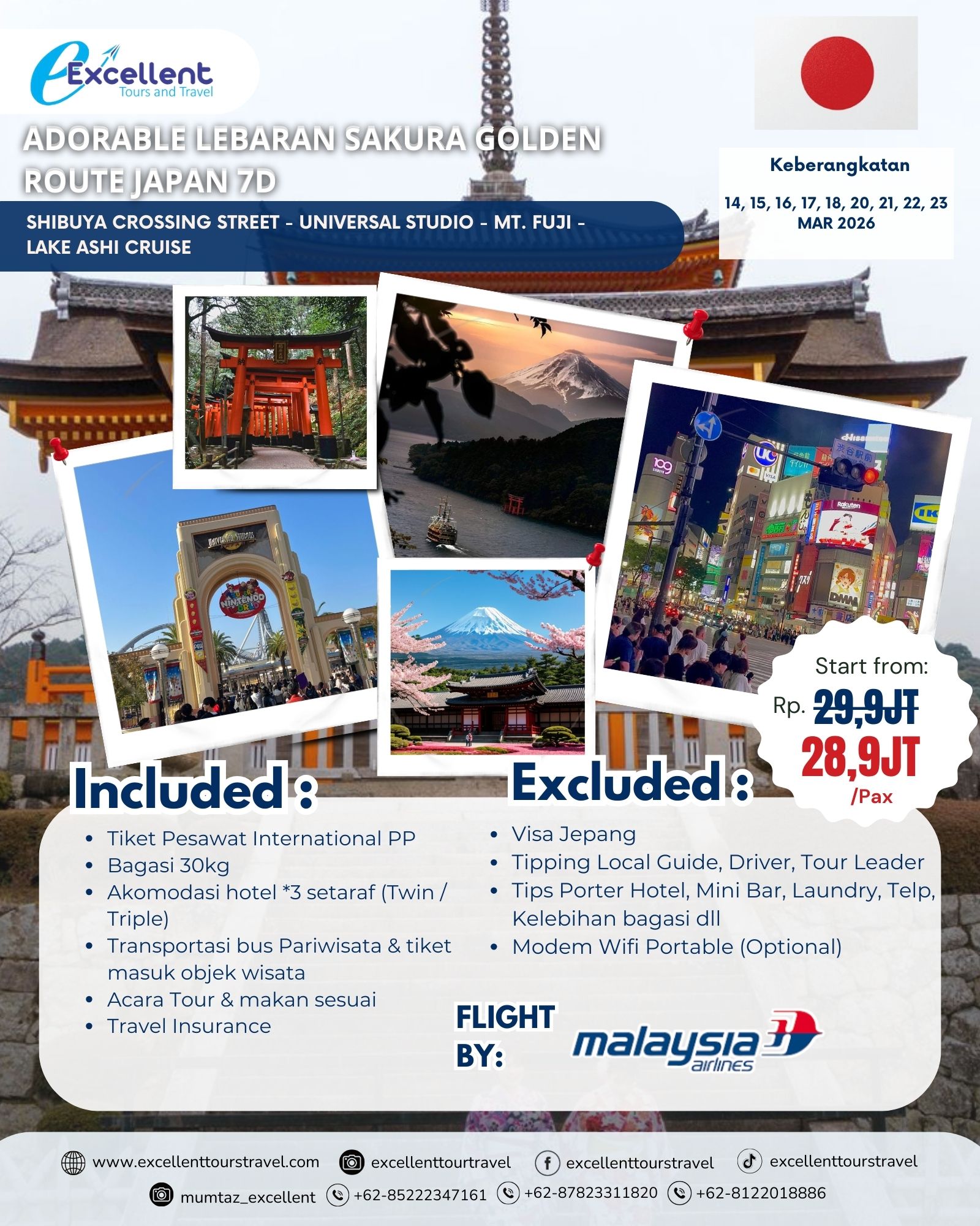 Golden Route Japan + Shirakawago ✨Osaka • Kyoto • Gifu • Mt. Fuji • TokyoNikmati perjalanan impian ke Jepang dengan rute favorit, spot ikonik, dan suasana kota modern hingga desa tradisional ❄️🏯 💰Harga spesial mulai Rp 19,9 JT/PAX ‼️✈️ Flight by Malaysia Airlines / ANA🗓️ 1, 8 APR 2026 Informasi…