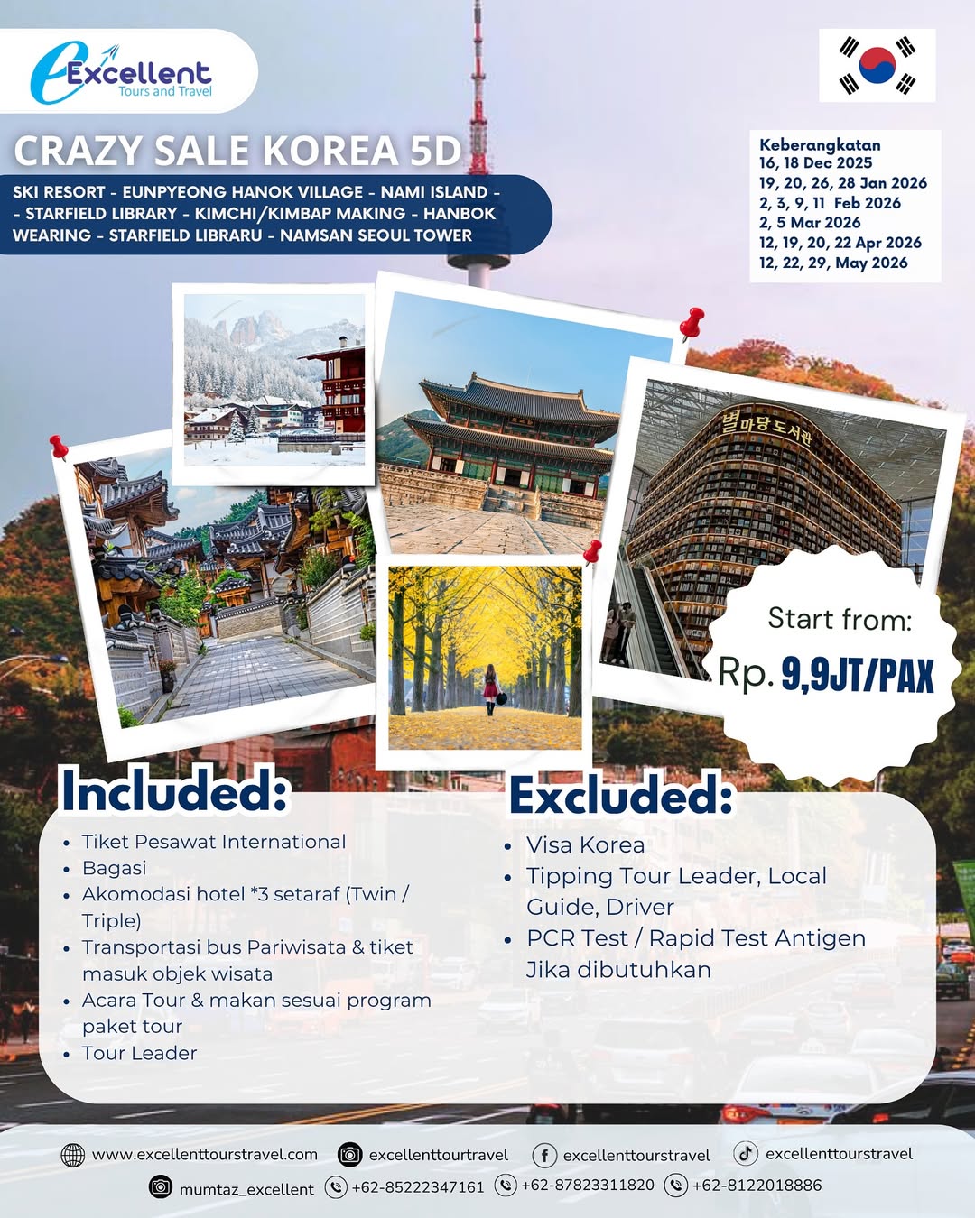 🎟 Termasuk: tiket pesawat internasional & bagasi, hotel bintang 3 (Twin/Triple), transportasi & tiket objek wisata