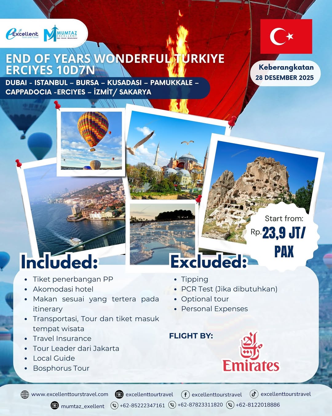 Akhiri tahun dengan perjalanan penuh warna ke negeri dua benua — Turkiye! Bersama Excellent Tour Travel x Mumtaz Excellent, nikmati liburan akhir tahun yang spektakuler dengan pengalaman seru dari Dubai – Istanbul – Bursa – Kusadasi – Pamukkale – Cappadocia – Erciyes – Izmit/Sakarya. 📆 Keberangkatan: 28 Desember 2025💸 Start…