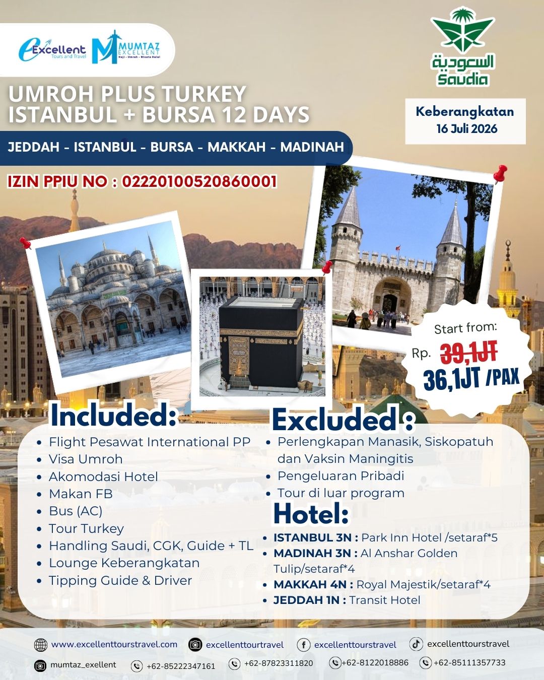 Sudah termasuk flight PP, visa umroh, hotel, makan, tour Turkey, handling & tipping guide.